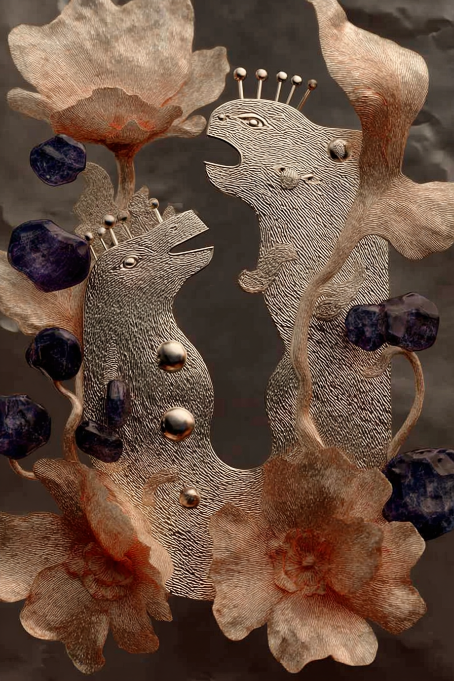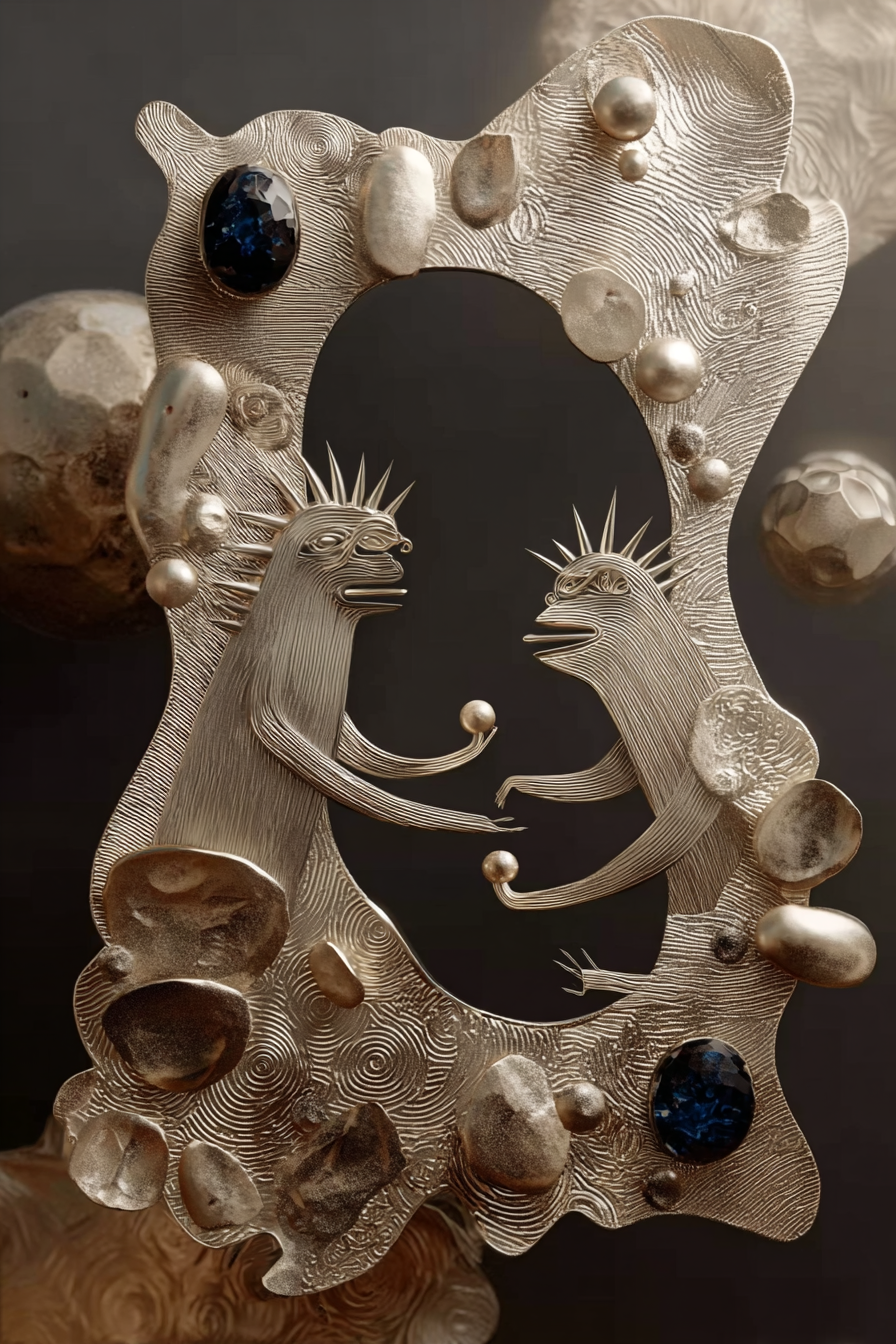 /Image promt: luxurious metallic-stone jewelry packaging inspired by ancient relic aesthetics, handcrafted silver box with embossed and engraved patterns, slightly irregular organic shape, mix of metal and stone textures, embedded gemstones (sapphire blue, ruby red, pearl white), mystical and refined design inspired by mythic spirits, soft matte sheen and tactile imperfections, detailed macro product photo, cinematic lighting, neutral background, high-end brand presentation, elegant and artistic composition, no mockups, centered layout --ar 16:9 --v 6