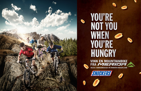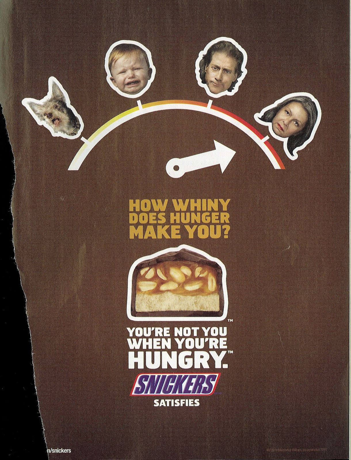 Рекламная кампания Snickers успешно убедила потребителей в том, что человек в состоянии голода перестает быть самим собой и не может соответствовать ожиданиям своей социальной группы. Батончик Snickers представлен как решение этой проблемы — он помогает вернуться к «правильной» форме себя, которая будет принята окружающими.