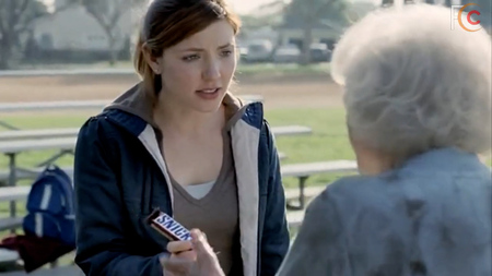 Кадры из рекламного ролика Snickers с участием Джоан Коллинс и Стефани Бэкхем