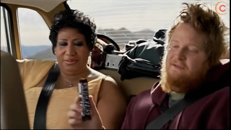 Звезды, сыгравшие в рекламных роликах Snickers. Слева направо: Джо Пеши, Эйб Вигода, Роуэн Эткинсон, Уиллем Дефо, Робин Уильямс, Элтон Джон, Лайза Миннелли, Арета Франклин, Ричард Льюис, Дени Трехо