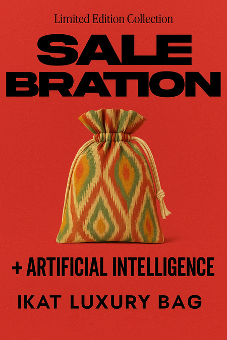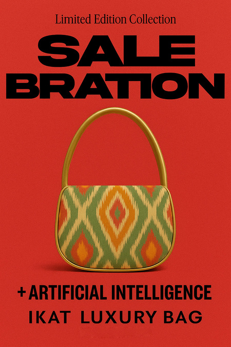 fashion campaign poster, bold typography, ikat handbag centered, minimal layout, warm palette, luxury editorial aesthetics
