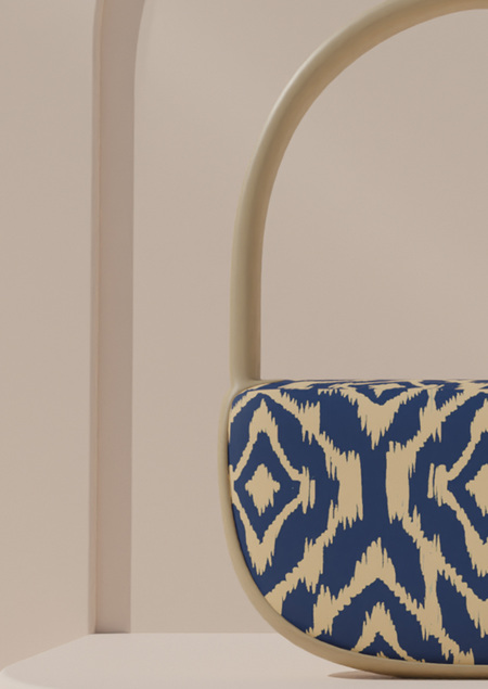 luxury handbag, modern silhouette, ikat textile pattern, soft beige studio background, product photoshoot, editorial lighting, high-end texture realism, 85 mm lens look