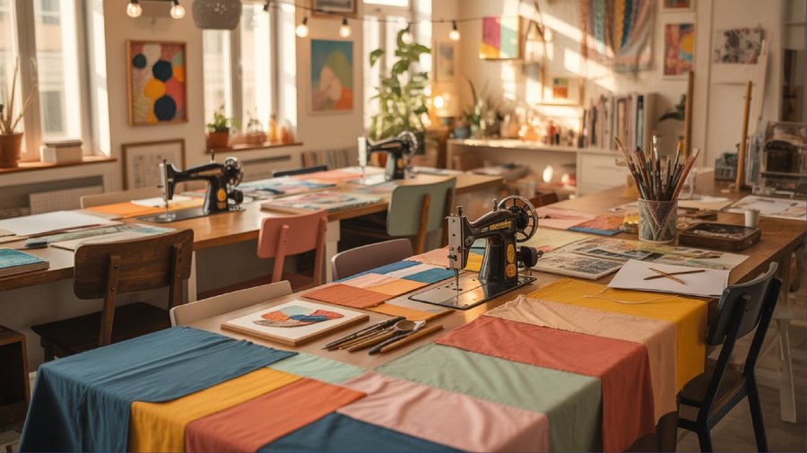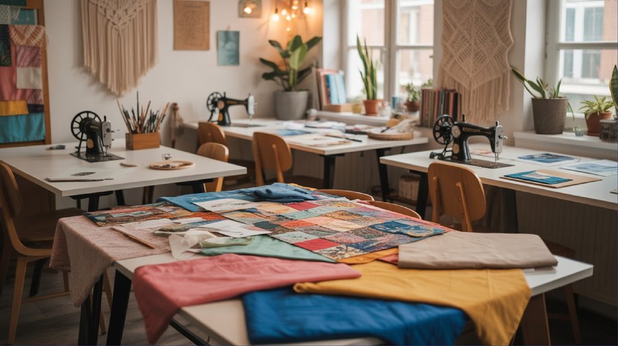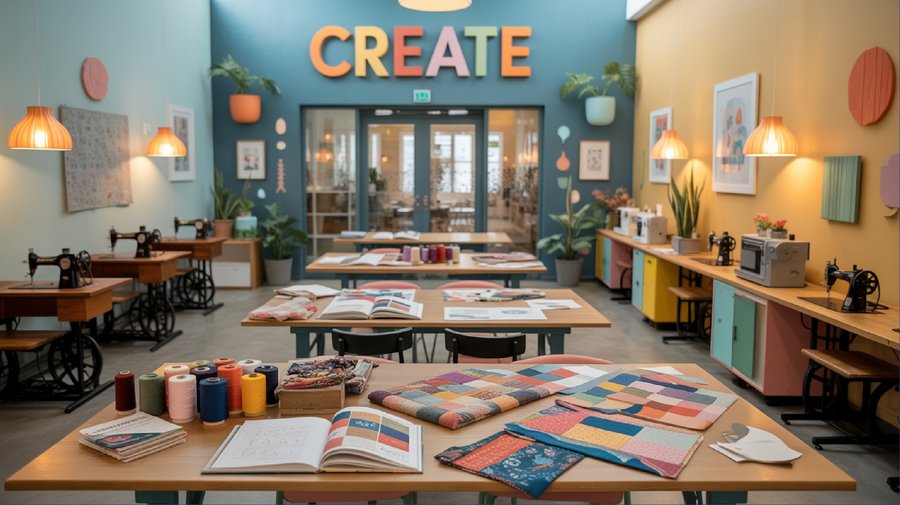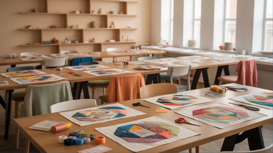 promt: Generate a realistic photo of a creative Patchwork Workshop in a student-friendly community space. Include tables with art supplies, vibrant stitched fabrics, and cozy, inspiring atmosphere. Lighting: warm and inviting. Colors: Ultramarine (2F3C7E), Coral (F76C6C), Ochre Yellow (FFD166), Mint Green (06D6A0), with neutral Beige (F4F1DE). Modern, bright, and creative interior.