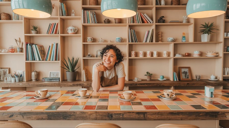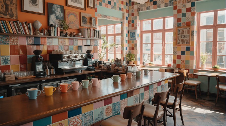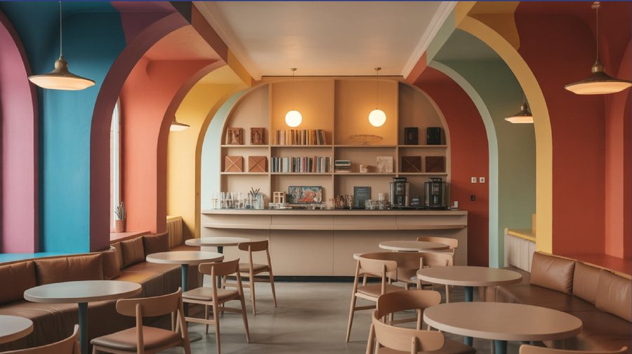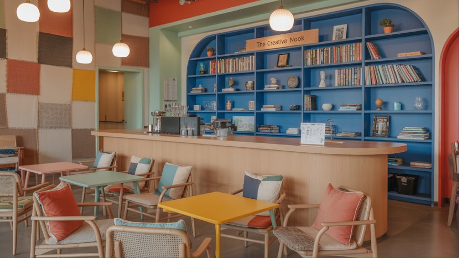 promt: Generate a realistic interior of a cozy café inside a creative Patchwork Space. Show a welcoming atmosphere with tables, chairs, coffee bar, and shelves with books and art supplies. Include colorful decorative elements inspired by patchwork patterns, warm lighting, and modern student-friendly design. Focus on layout, textures, and cozy details without any people. Colors: Ultramarine (2F3C7E), Coral (F76C6C), Ochre Yellow (FFD166), Mint Green (06D6A0), with neutral Beige (F4F1DE). Modern, bright, and inspiring interior, suitable for a creative community space.