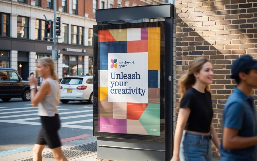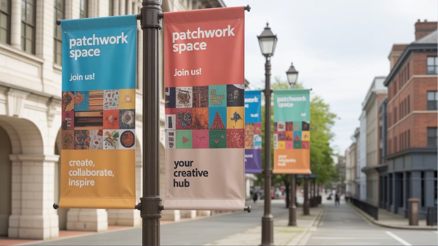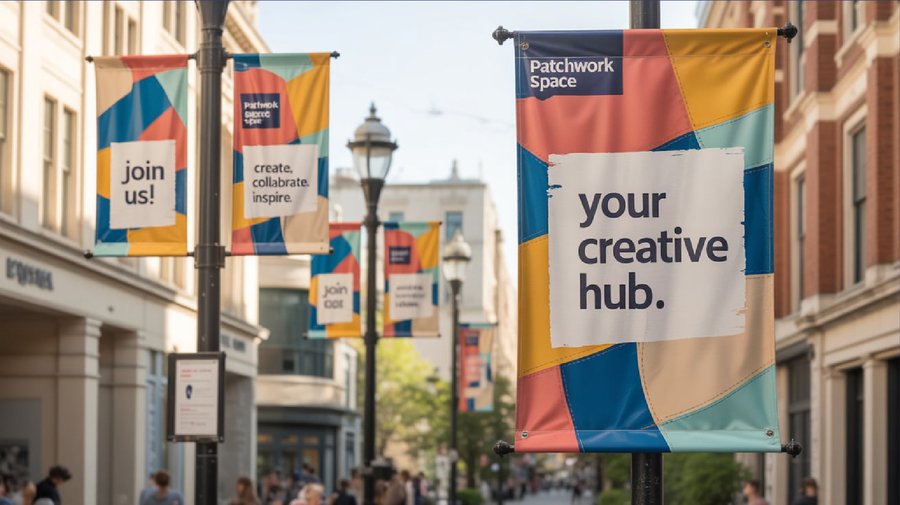 promt: Generate realistic images of advertising banners for «Patchwork Space» displayed in real-life environments. Show banners on walls, street poles, or outdoor signs in a student-friendly area or university campus. The banners should be colorful, vibrant, and inspiring, featuring elements of patchwork, colorful fabrics, and creative patterns. Include text placeholders like «Join us!», «Create, Collaborate, Inspire», and «Your Creative Hub». Style: modern, playful, and welcoming. Colors: Ultramarine (2F3C7E), Coral (F76C6C), Ochre Yellow (FFD166), Mint Green (06D6A0), with neutral Beige (F4F1DE). The scene should look realistic, as if photographed in real life, with good lighting and perspective.