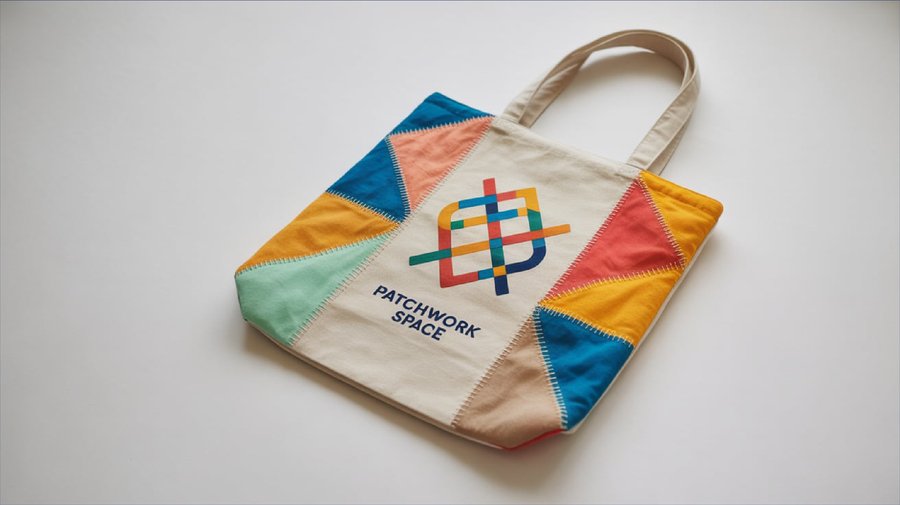 shopping bag promt: Generate a realistic image of a white tote bag (shopper) lying flat on a plain white background, designed for visitors of «Patchwork Space». The tote bag should feature a modern and creative design inspired by patchwork patterns, colorful stitched fabrics, and geometric shapes. Style: playful, modern, and artistic. Colors: Ultramarine (2F3C7E), Coral (F76C6C), Ochre Yellow (FFD166), Mint Green (06D6A0), with neutral Beige (F4F1DE). The design should reflect creativity, collaboration, and unity in diversity, suitable for printing on a tote bag.