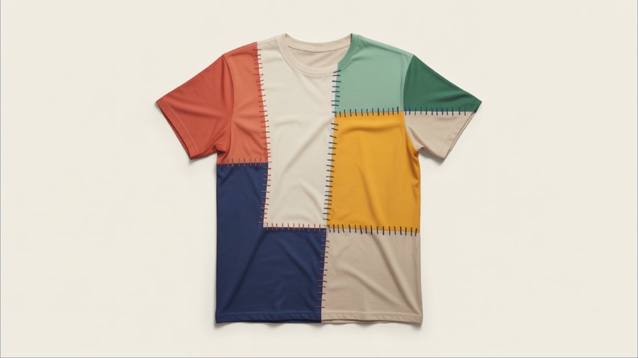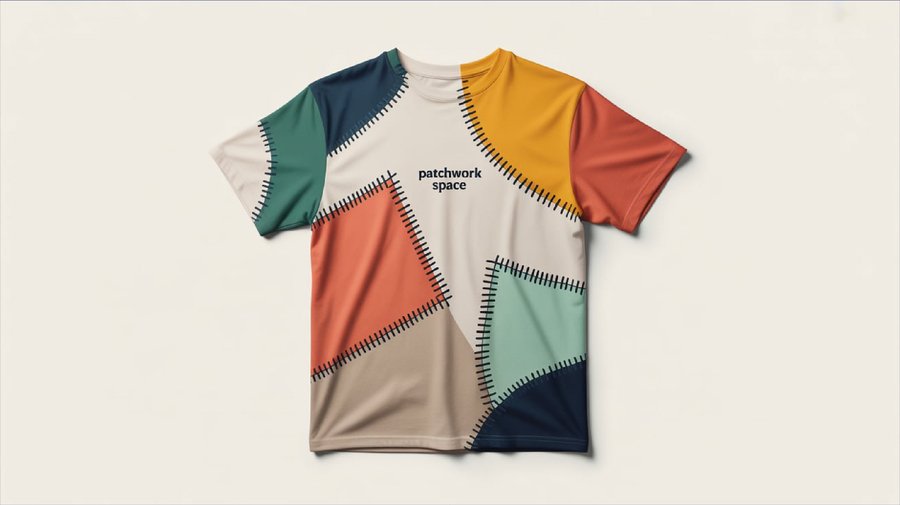 t-short promt: Generate a realistic image of a white t-shirt lying flat on a plain white background, designed for visitors of «Patchwork Space». The t-shirt should feature a modern and creative design inspired by patchwork patterns, colorful stitched fabrics, and geometric shapes. Style: playful, modern, and artistic. Colors: Ultramarine (2F3C7E), Coral (F76C6C), Ochre Yellow (FFD166), Mint Green (06D6A0), with neutral Beige (F4F1DE). The design should reflect creativity, collaboration, and unity in diversity, suitable for printing on a t-shirt.
