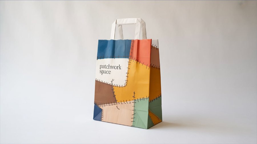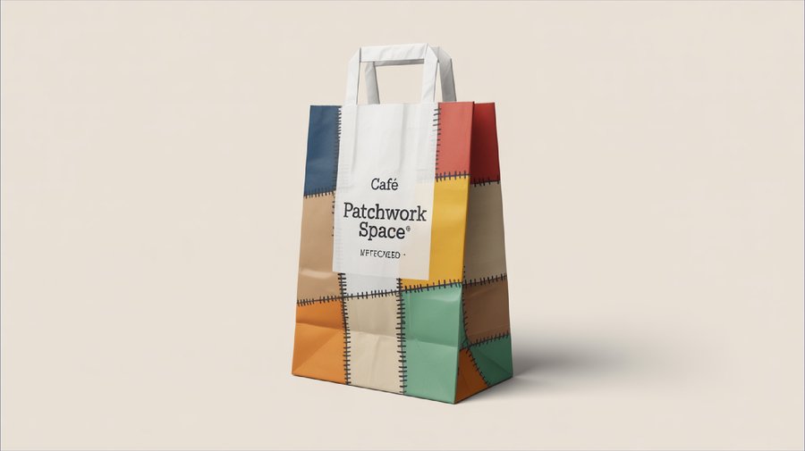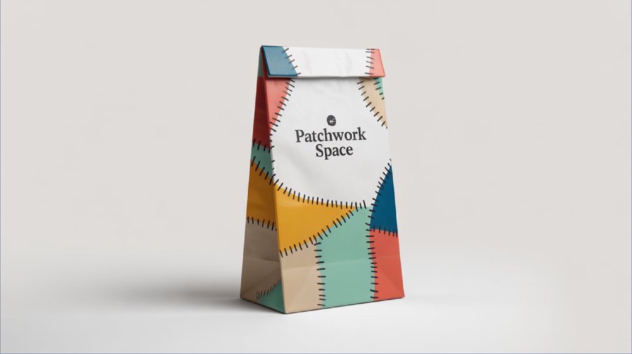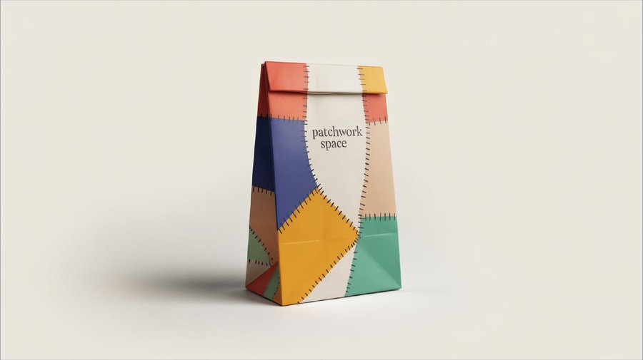 paper bag promt: Generate a realistic image of a white paper takeaway bag standing upright on a plain white background, designed for the café inside «Patchwork Space». The bag should feature a modern and creative design inspired by patchwork patterns, colorful stitched fabrics, and geometric shapes. Style: playful, modern, and artistic. Colors: Ultramarine (2F3C7E), Coral (F76C6C), Ochre Yellow (FFD166), Mint Green (06D6A0), with neutral Beige (F4F1DE). The design should reflect creativity, collaboration, and unity in diversity, suitable for printing on a paper bag.