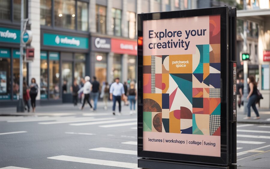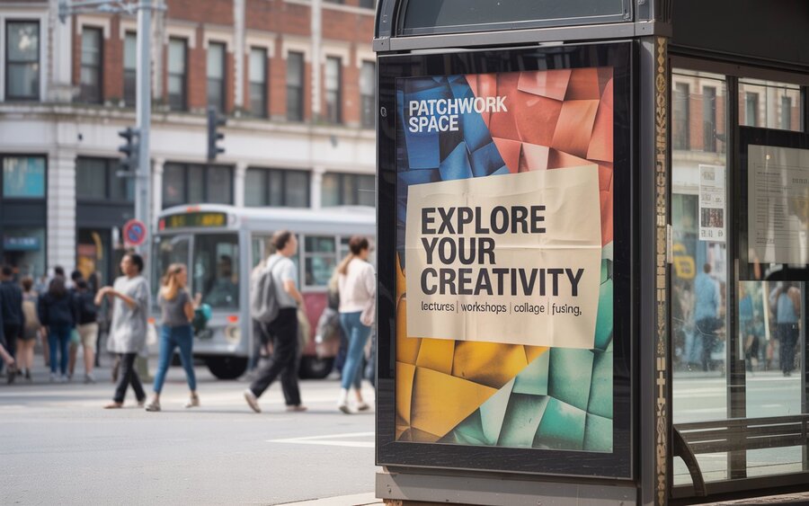 promt: Generate a realistic image of an outdoor advertising poster for «Patchwork Space» displayed on city streets. The poster should promote lectures, patchwork workshops, collage, and fusing classes. Style: modern, artistic, and colorful, inspired by patchwork (quilting, collage, geometric patterns). Colors: Ultramarine (2F3C7E), Coral (F76C6C), Ochre Yellow (FFD166), Mint Green (06D6A0), with neutral Beige (F4F1DE). Show the poster placed in real-life urban settings such as bus stops, billboards, or street walls. The scene should look like a professional photo of street advertising in a lively city environment.