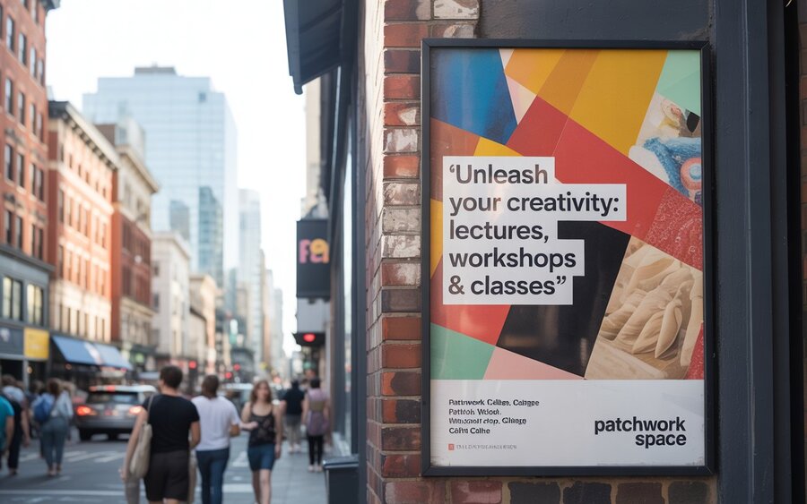 Запрос в ChatGPT: Напиши промт для создания изображения с рекламной афишей пространства «Patchwork space» на улицах города, где происходят лекции, мастер классы по печворку, коллажу и фьюзингу