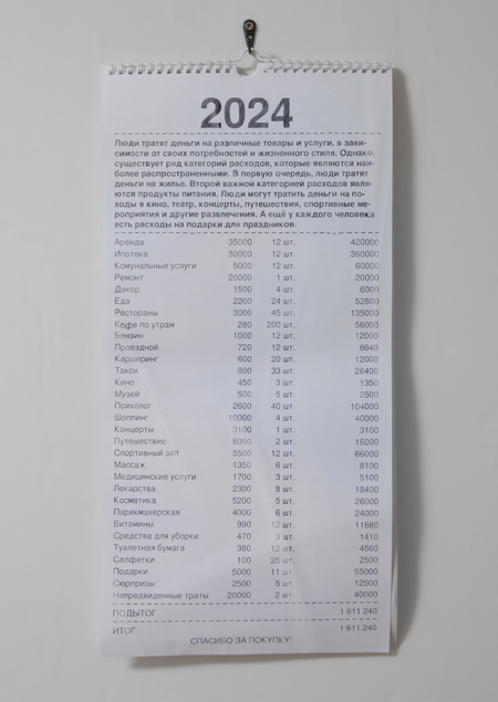 «Календарь покупок» — календарь, в котором каждый месяц посвящён самым основным покупкам, которые обычно человек совершает за это время. Например, в декабре люди закупаются подарками, мандаринами, продуктами для салатов