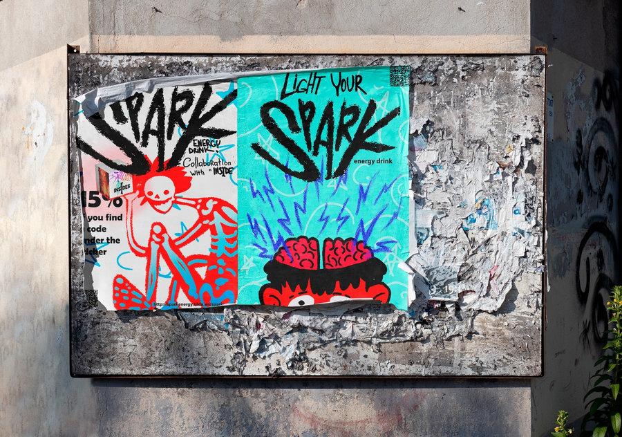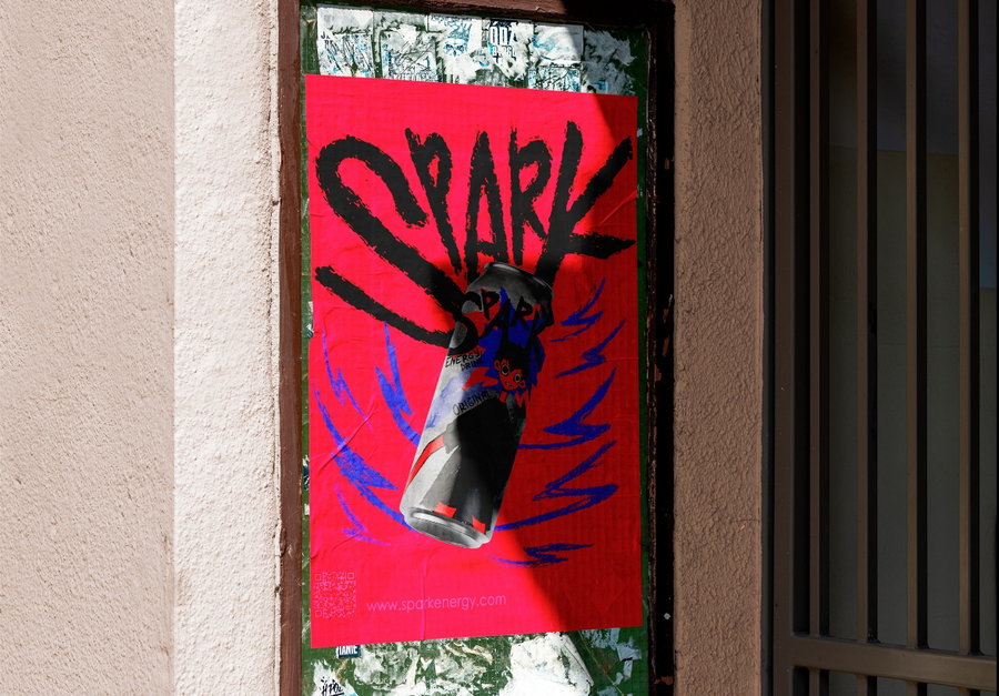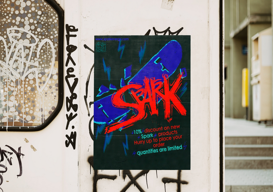 Scene of an urban street with a single poster for Spark energy drink displayed on a wall. The poster features a broken, hand-drawn electric guitar with psychedelic waves and energy fields radiating around it. The text 'Spark energy drink' is in bold, futuristic typography, with the minimalist logo—a star encased in barbed wire with an eye at the center in lilac and pink hues—next to the text. The poster is affixed to an urban wall, surrounded by graffiti and street art, giving the scene an edgy, vibrant atmosphere. The setting feels dynamic and creative, with the poster standing out against the backdrop of the street