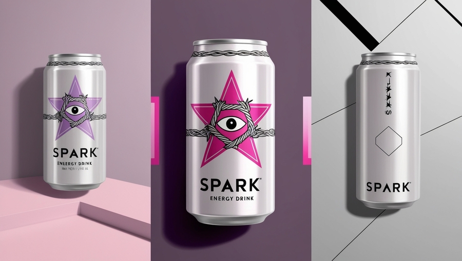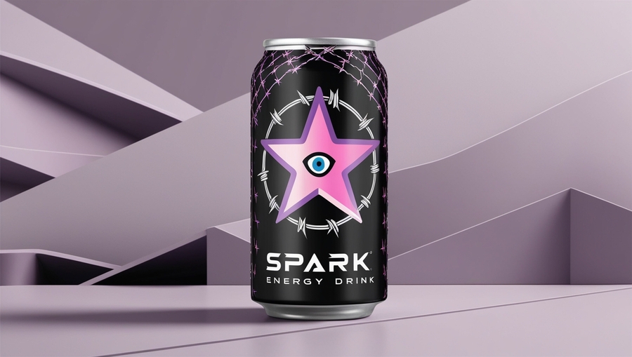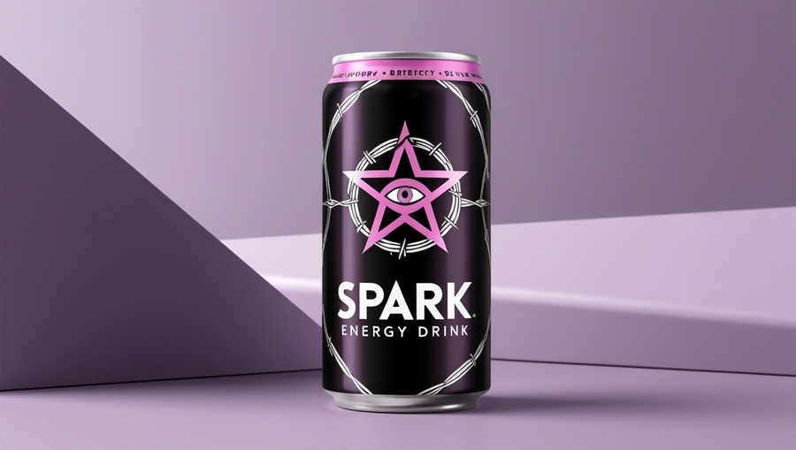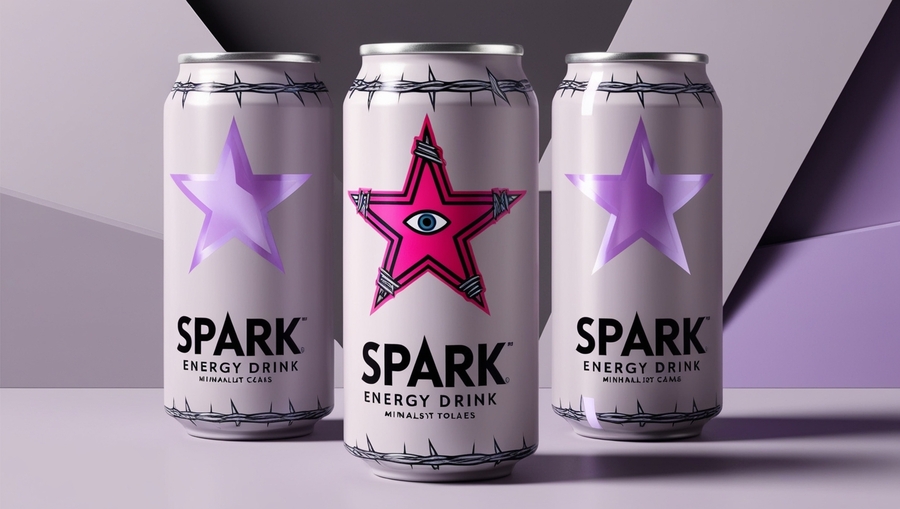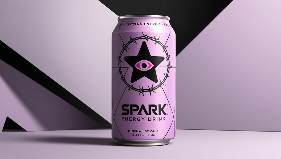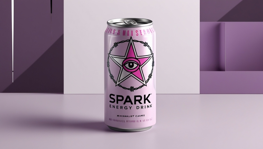 Промпт: Design for Spark energy drink cans featuring the brand’s minimalist logo—a star encased in barbed wire with an eye at the center, in lilac and pink hues. The can design is sleek, modern, and minimalistic, with the logo prominently displayed in the center. The background is a smooth, matte monochrome color, with subtle gradients or geometric patterns to add depth without distracting from the logo. The can also features the word 'Spark' in bold, futuristic typography, placed in a simple, clean font. The overall design exudes energy, creativity, and sophistication, with an urban edge that reflects the brand’s bold character.