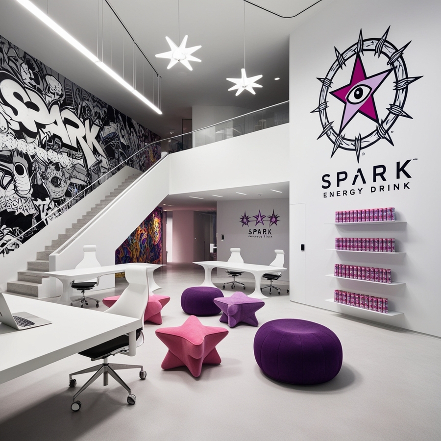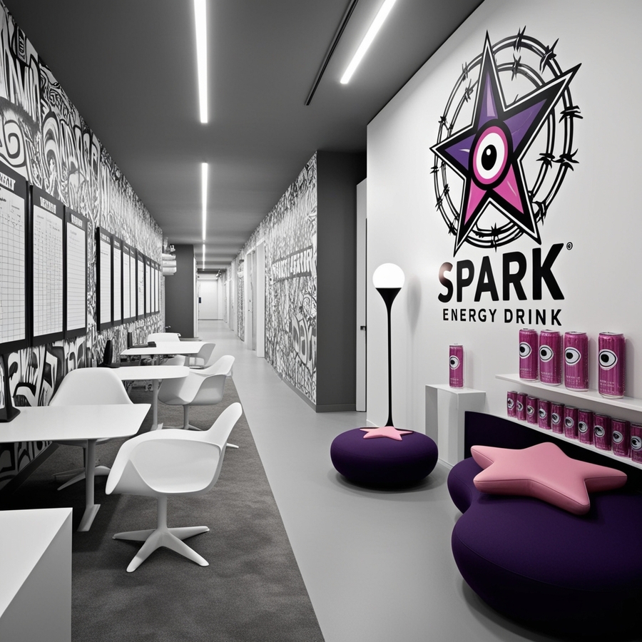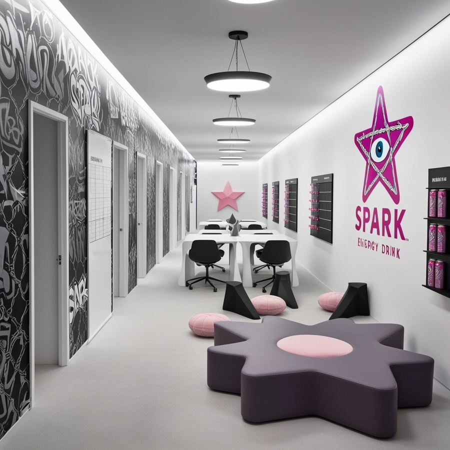 An ultra-minimalist office for the Spark energy drink, featuring the logo—a minimalist star encased in barbed wire and an eye at the center in lilac and pink hues—on the right wall. The office is deep, with multiple corridors leading to different areas. The walls are covered in bold, monochrome graffiti patterns, blending urban street art with minimalist design. Futuristic desks and chairs fill the space, and unique poufs in the shape of stars are scattered around. A striking minimalist desk lamp in the shape of an eyeball adds a quirky yet sleek touch. There’s a sofa shaped like a star, serving as a focal point in the room. On the walls, there are boards with task lists and project plans for the employees. Spark energy drink cans are neatly displayed on modern, minimal shelves. The lighting is minimal but striking, with unusual fixtures hanging from the ceiling. The office exudes a creative, open, and futuristic atmosphere, combining functionality with bold, innovative design.