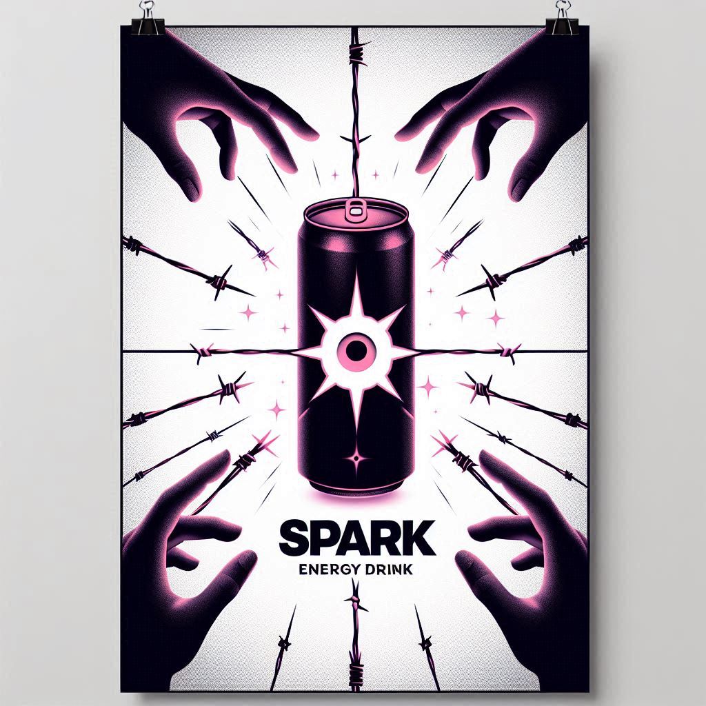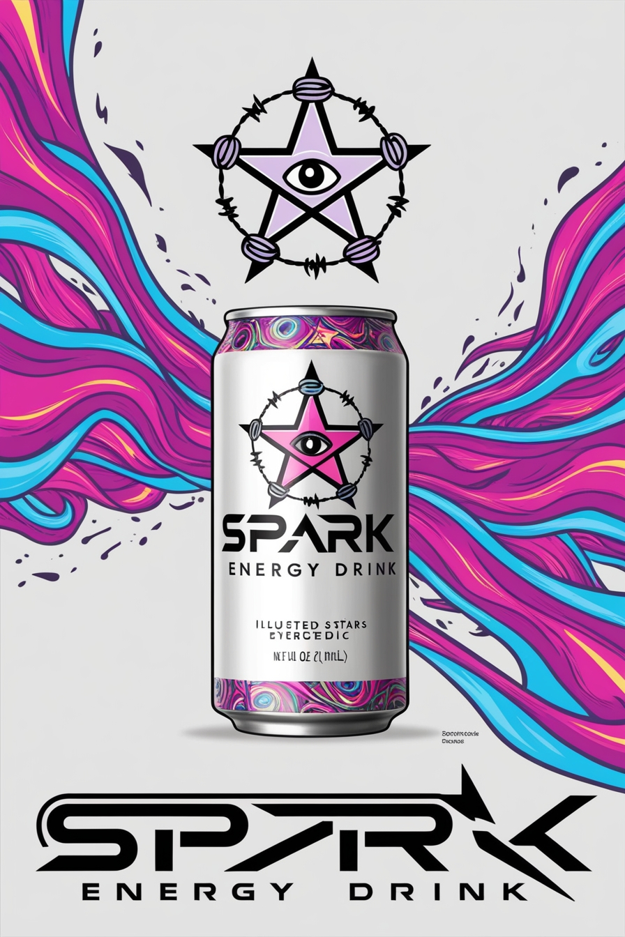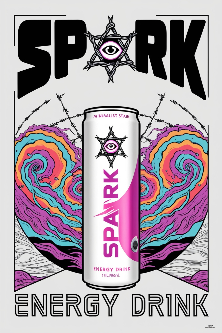 Poster design for Spark energy drink featuring the minimalist logo—a star encased in barbed wire with an eye at the center in lilac and pink hues. The design includes a sleek, illustrated can of Spark energy drink as the central focus. Around the can, vibrant, swirling psychedelic waves and an energetic field emanate, creating a sense of movement and power. The background is white or monochrome, with the text 'Spark energy drink' in bold, futuristic typography. The overall design combines minimalism with psychedelic energy, reflecting the brand’s dynamic and creative vibe