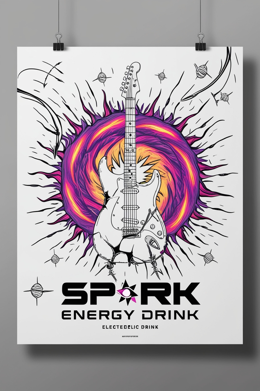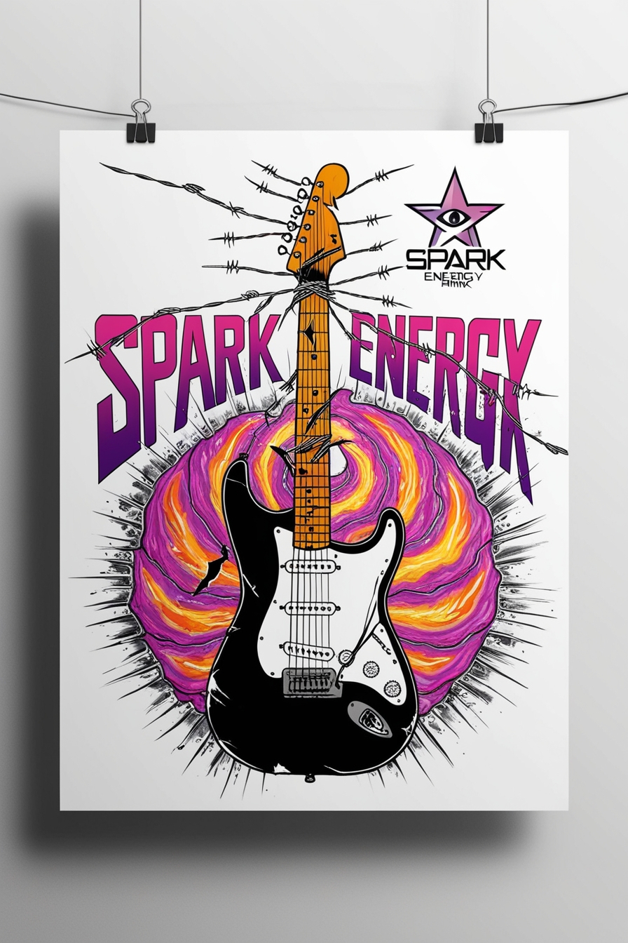 Poster design for Spark energy drink with a white or monochrome background. The design features a broken, hand-drawn electric guitar as the central element, with the strings appearing to snap or scatter into the air. Around the guitar, vibrant, swirling psychedelic waves and an energetic field emanate, creating a sense of power and movement. The text 'Spark energy drink' is displayed in bold, futuristic typography, with the minimalist logo—a star encased in barbed wire with an eye at the center in lilac and pink hues—positioned alongside the text. The overall design blends minimalism with psychedelic energy, reflecting the bold, dynamic essence of the brand