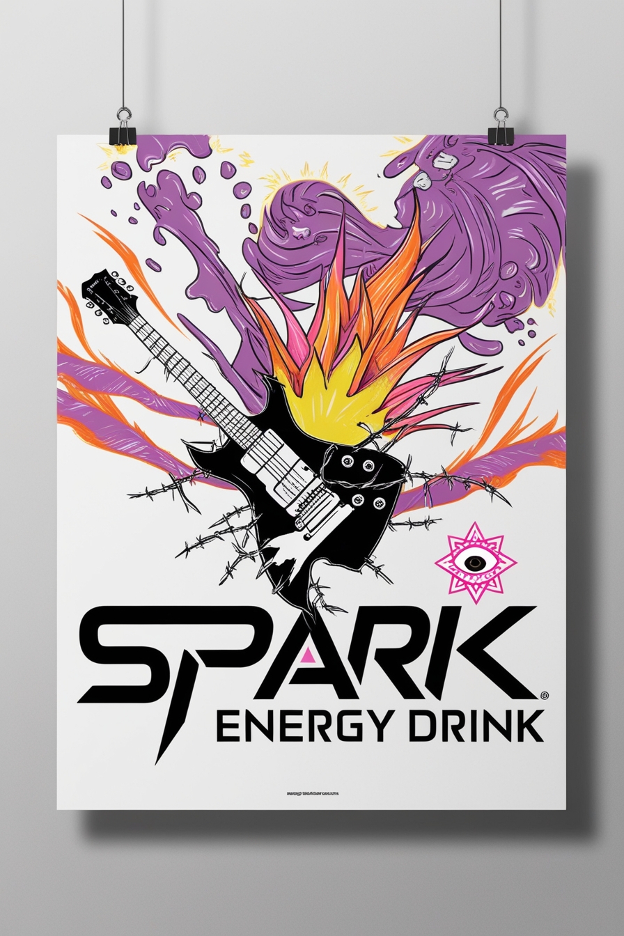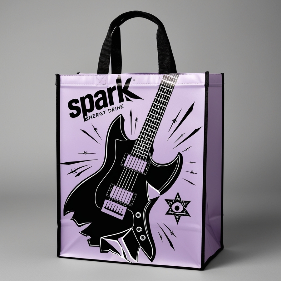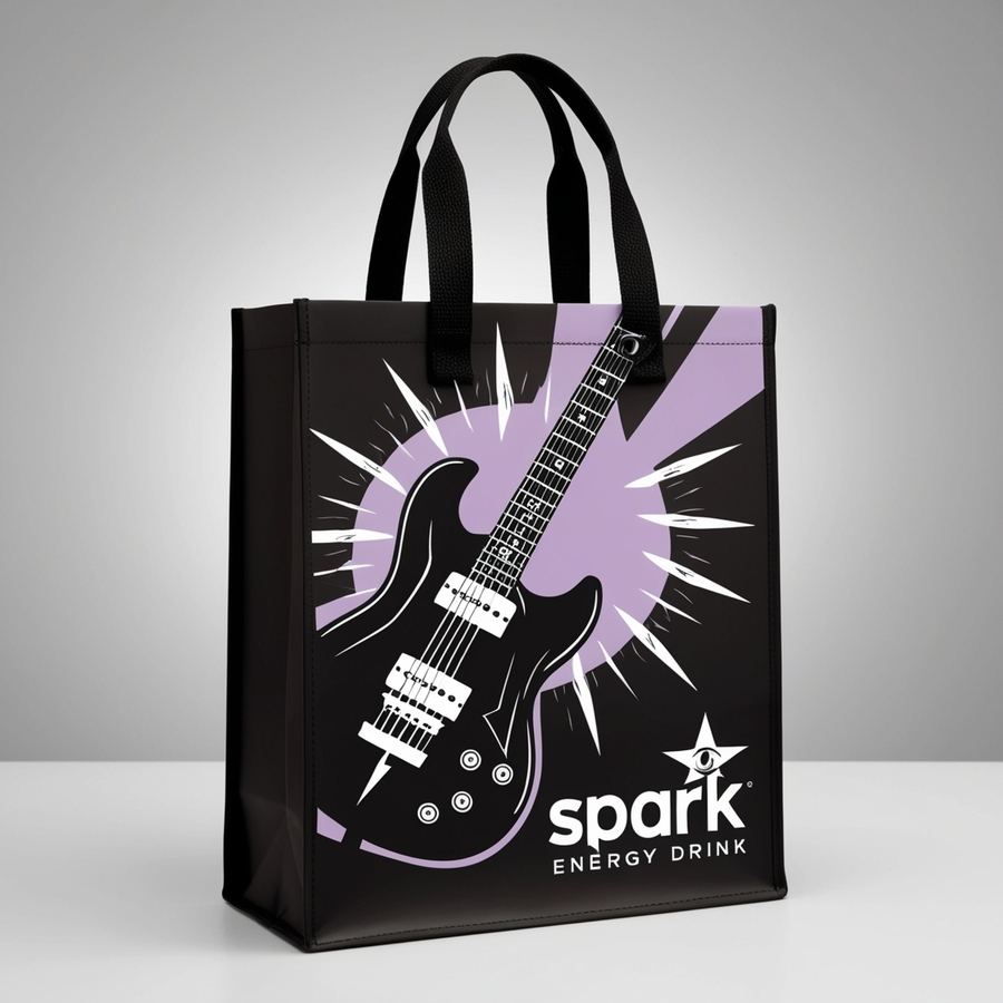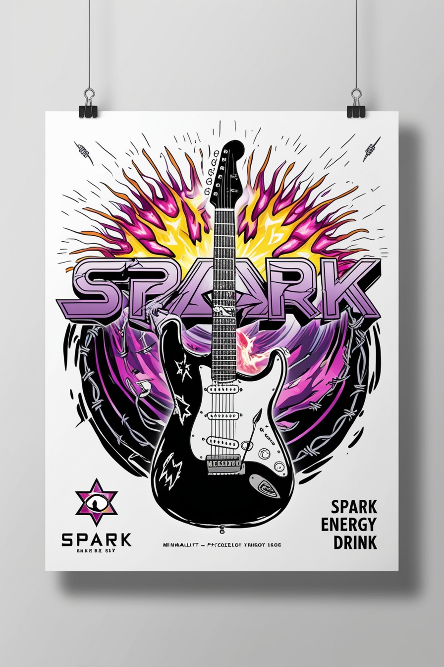 Design a bold and dynamic shopper bag for Spark energy drink featuring a broken electric guitar as the central design element. The guitar should be drawn in a minimalist, yet striking style, with sharp, clean lines to emphasize its broken form. The design should be in black and lilac tones, with subtle sparks or energy waves radiating from the broken guitar, symbolizing the power and energy of Spark. The Spark logo—a star encased in barbed wire with an eye at the center—should be placed prominently on the bag, with bold, simple typography. The background of the bag should be solid, with clean edges, keeping the focus on the guitar and logo. The bag should be made from durable fabric, with strong handles, offering both style and practicality, while capturing the brand’s bold, energetic essence