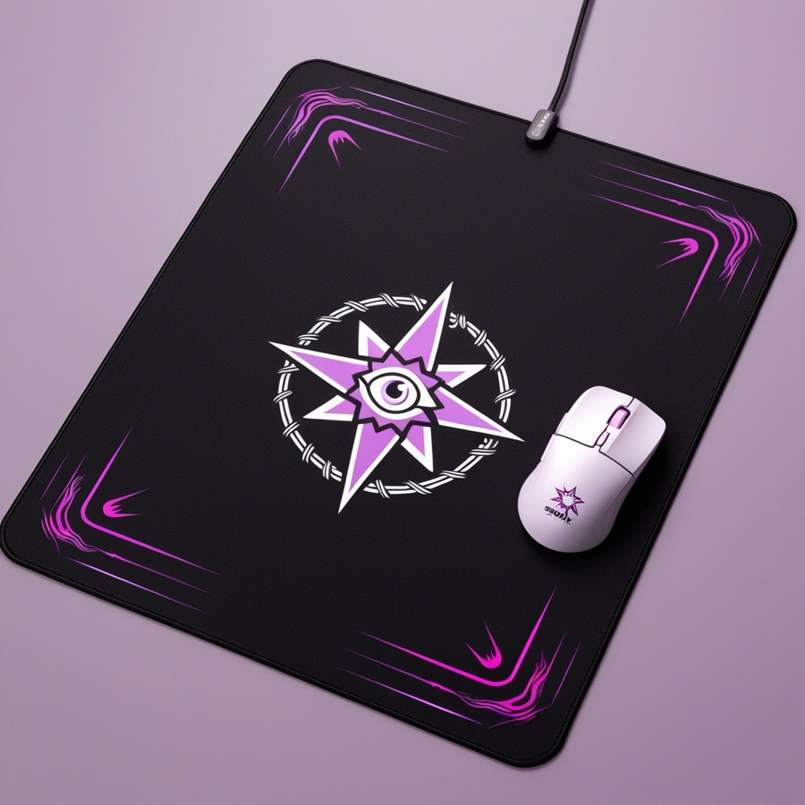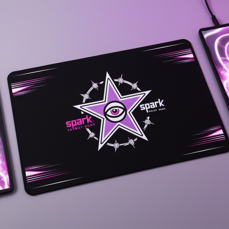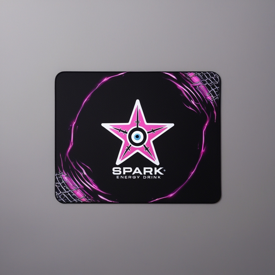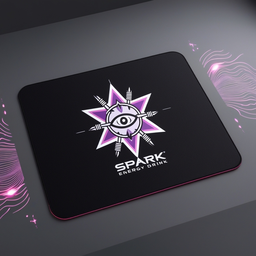 Design a sleek, modern mouse pad for Spark energy drink. The mouse pad features a minimalist background in black or dark gray, with the Spark logo— a star encased in barbed wire with an eye at the center— prominently displayed in lilac and pink hues. Surrounding the logo are subtle psychedelic patterns, such as glowing waves or sparks, creating a dynamic and energetic feel. The design should be clean, with bold lines and a smooth finish, reflecting the brand’s bold, edgy, and futuristic essence. The overall look should be vibrant yet minimal, perfect for gamers or anyone who wants to add a touch of energy to their workspace