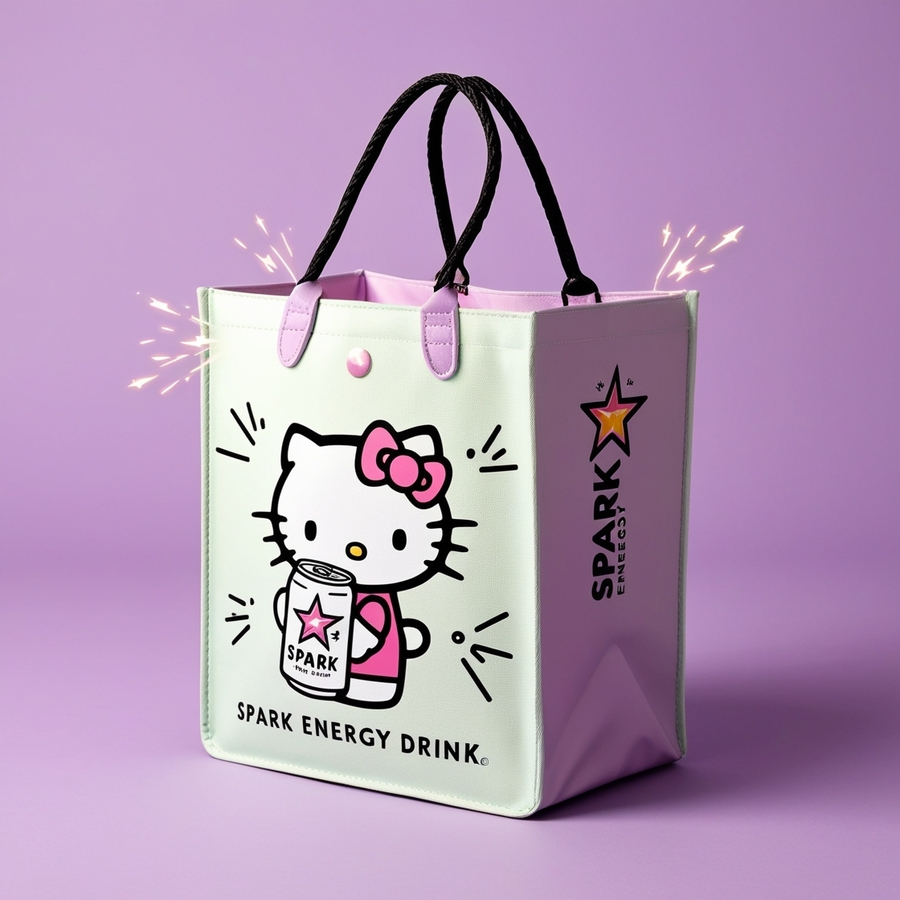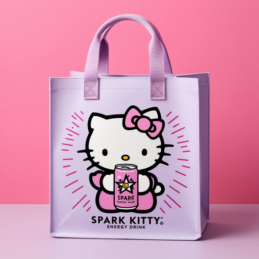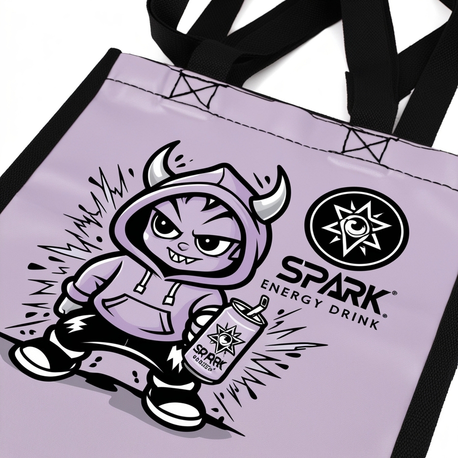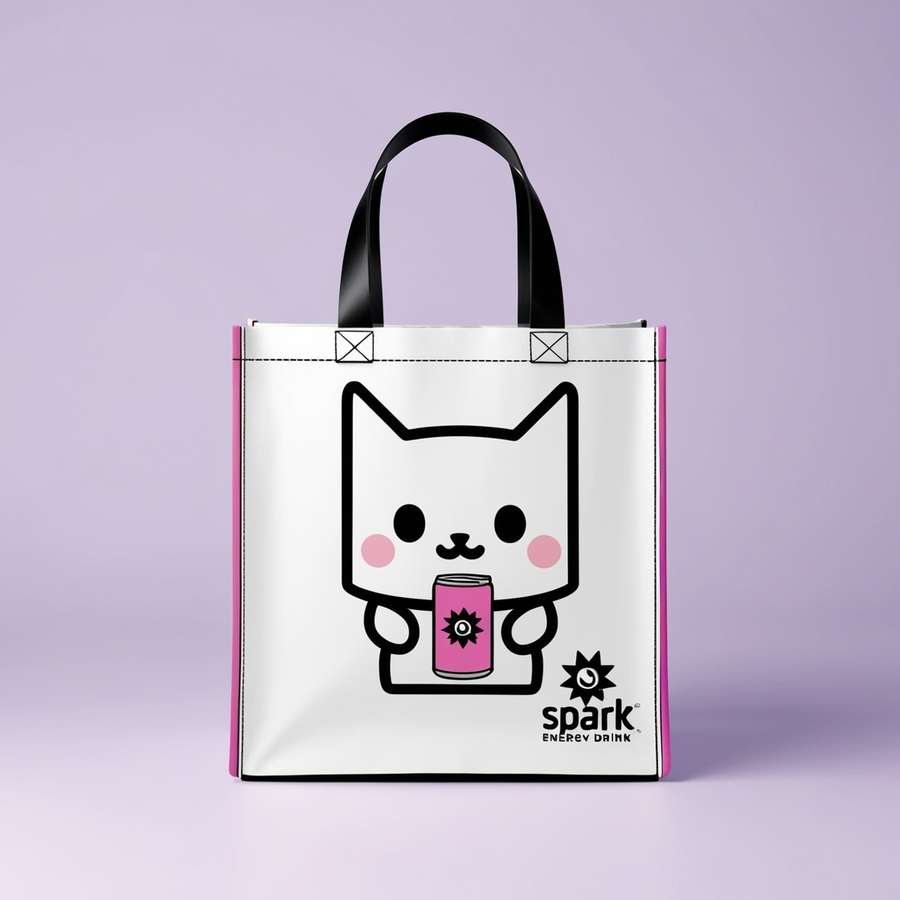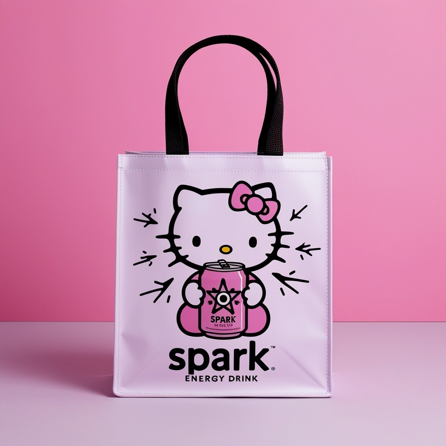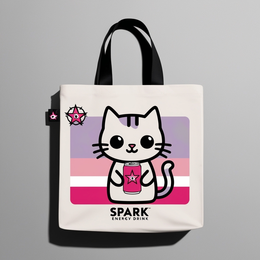 Design a cute and playful shopper bag for Spark energy drink featuring a character inspired by Hello Kitty. The character should have a simple, adorable appearance with big eyes, a small bow on her head, and a minimalist style. She should be holding a can of Spark energy drink, with subtle sparks or energy lines radiating from the can, symbolizing the drink’s power and vibrancy. The character’s colors should be in soft pastel tones, like lilac and pink, matching the brand’s color scheme, while keeping the overall design simple and clean. The Spark logo—featuring a star encased in barbed wire with an eye at the center—should be placed prominently on the bag, with bold, modern typography. The background of the bag should be a solid color, either black, white, or a soft pastel, allowing the character and logo to stand out. The bag should be made of durable fabric with strong handles, combining cuteness and energy in one stylish and functional accessory