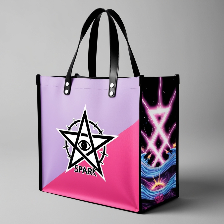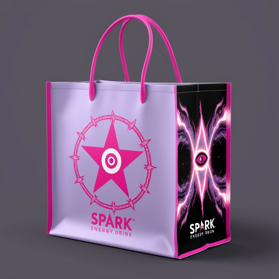 Design a stylish, modern shopper bag for Spark energy drink. The bag should feature the minimalist Spark logo—a star encased in barbed wire with an eye at the center—in bold lilac and pink hues. The design should be sleek, with the logo prominently displayed on one side, while the other side can feature dynamic, abstract psychedelic patterns, such as glowing waves, sparks, or lightning bolts, symbolizing energy and power. The bag should be made from high-quality, durable fabric with strong handles. The overall aesthetic should be bold, creative, and youthful, reflecting the brand’s vibrant and edgy spirit