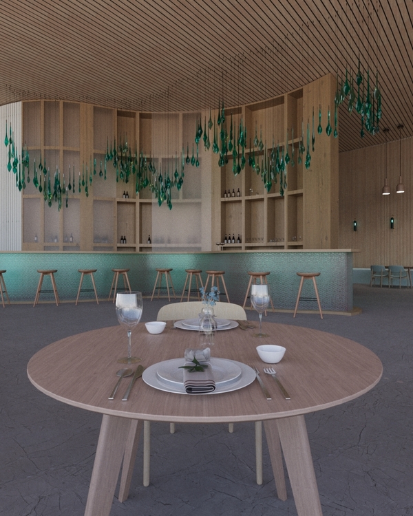 Дизайн — проект ресторана вдохновлен архитектором Алваром Аалто. Ресторан расположен в Горном Алтае на берегу реки Катунь. В интерьере ресторана преобладают изогнутые, сложные формы, дерево, изумрудные и бирюзовые оттенки.