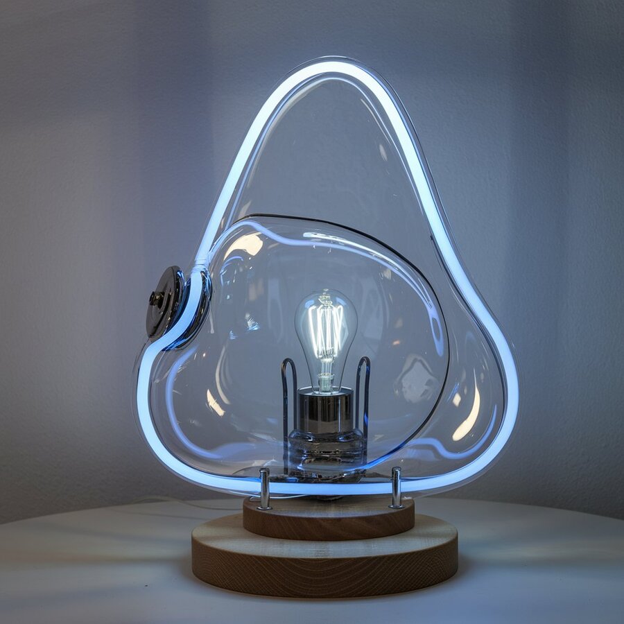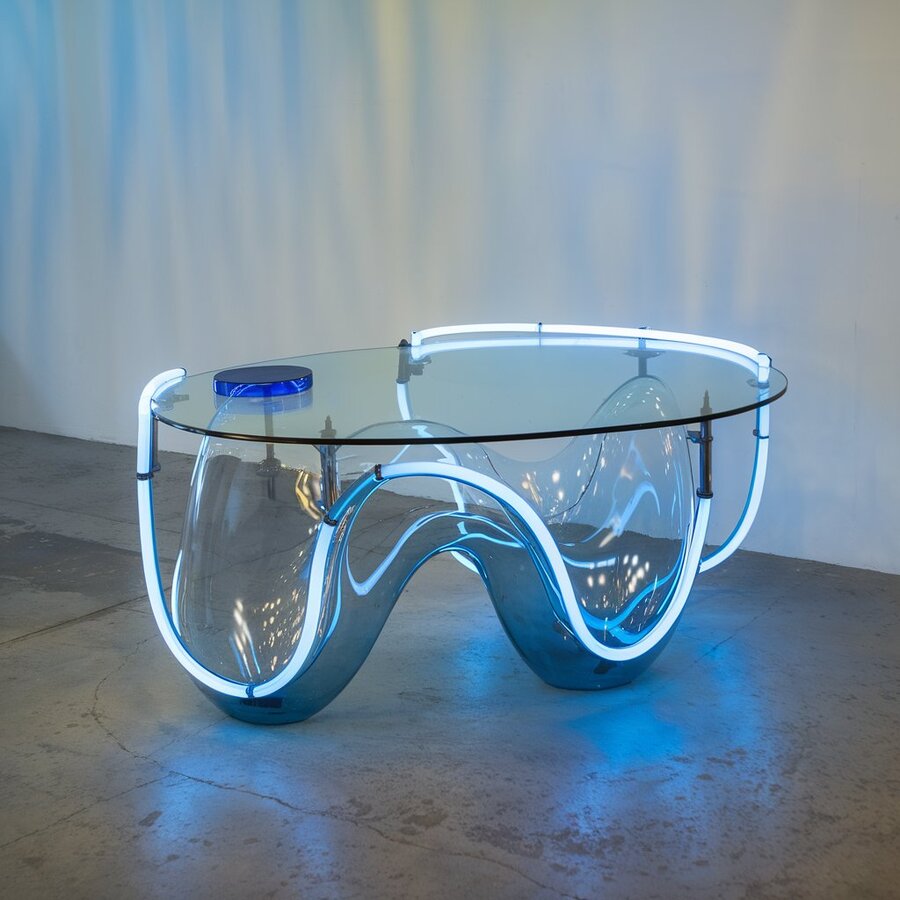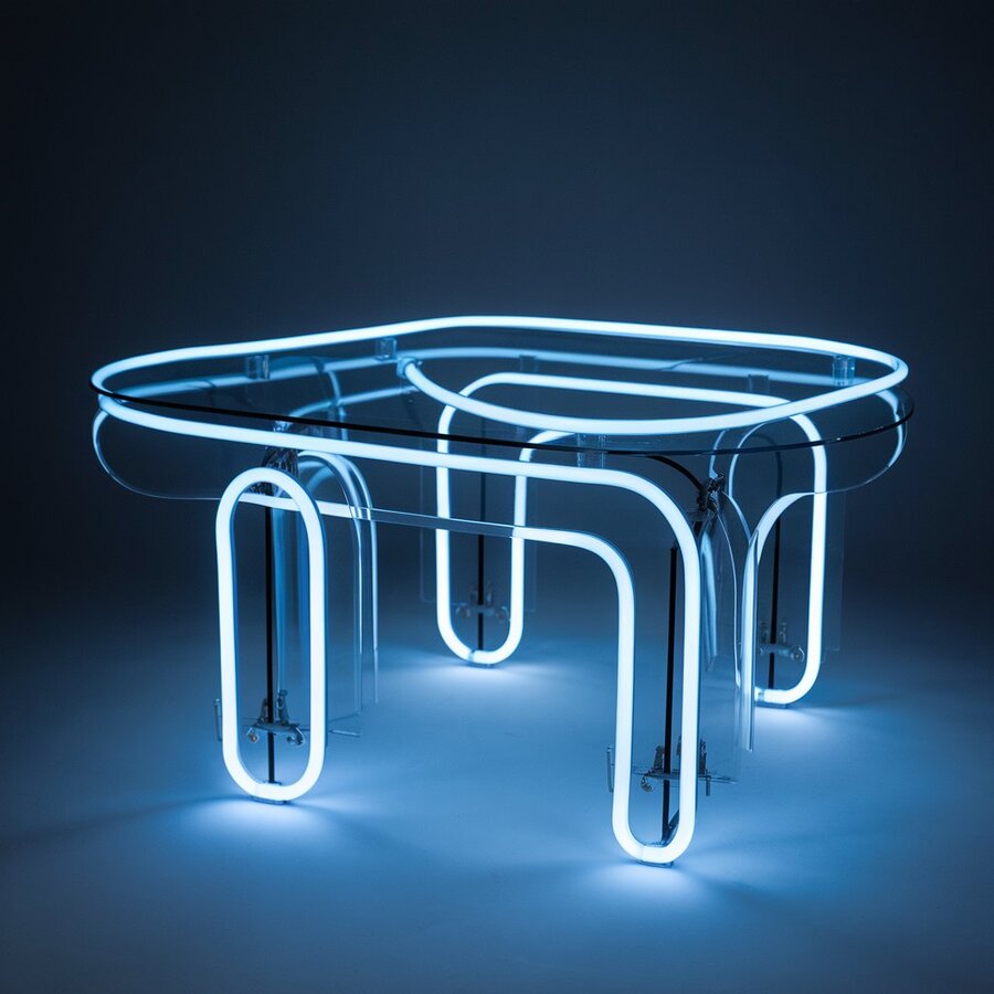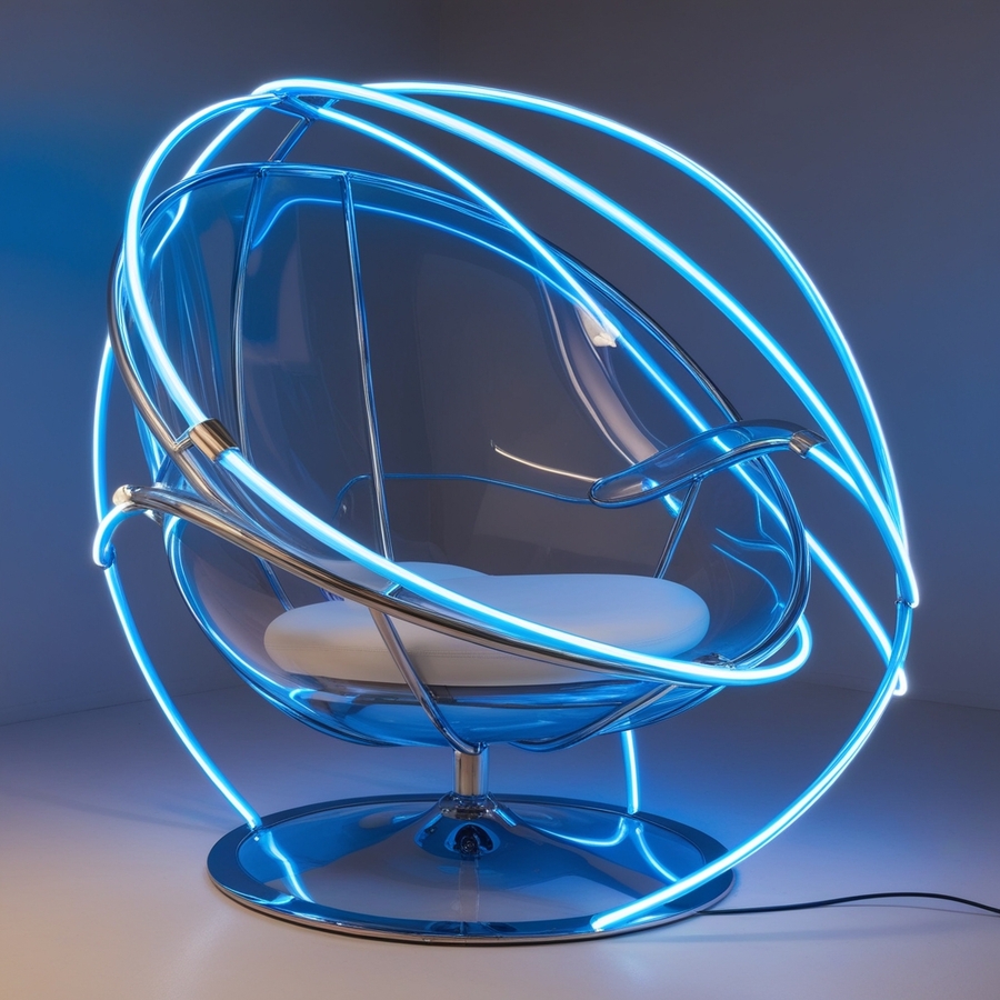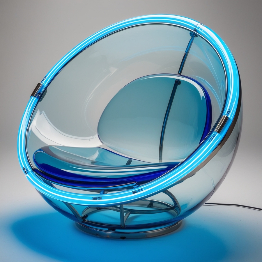 Prompt: The lamp (chair/ table) has a smooth shape in the style of a blobitecture, the distinctive feature of which is the blue luminous frame lines. materials glass, neon, small amount of metal