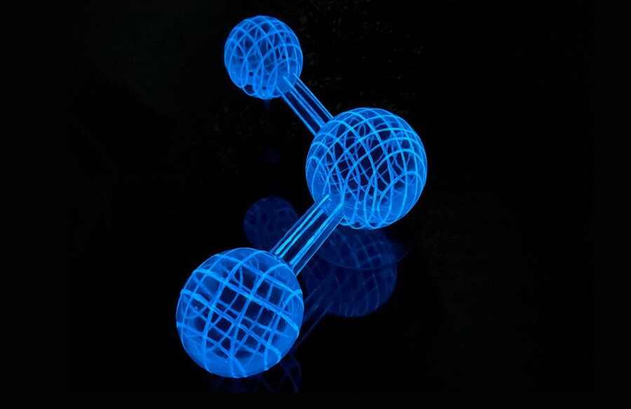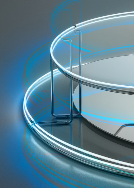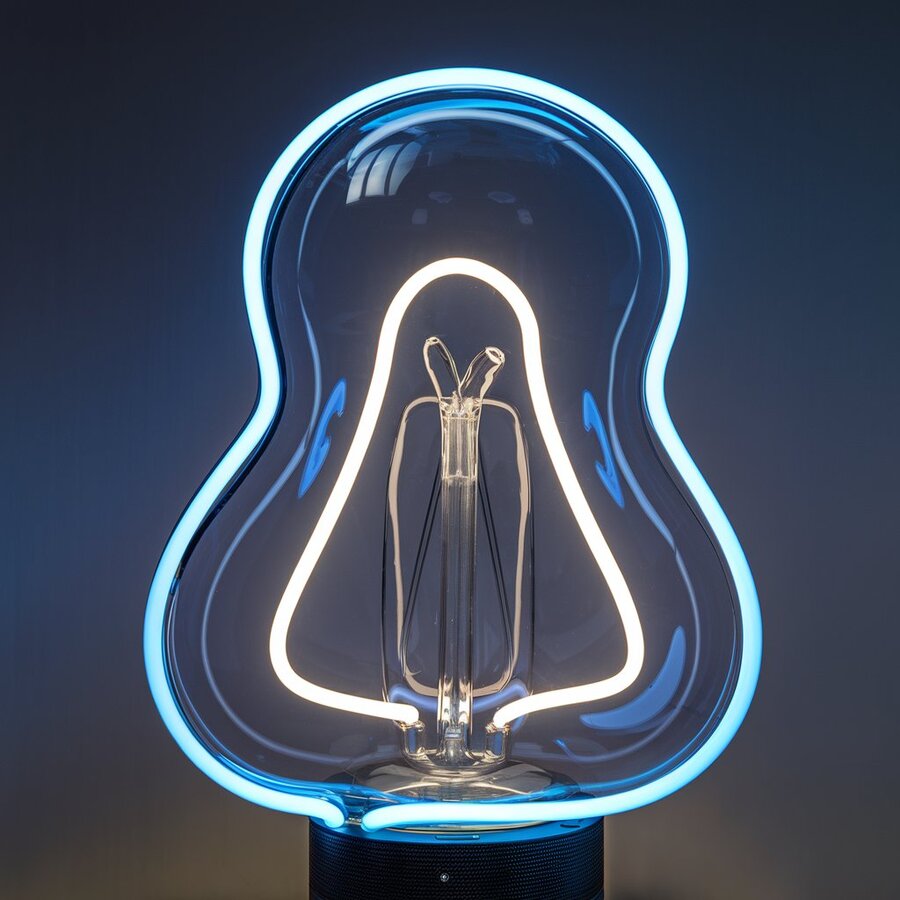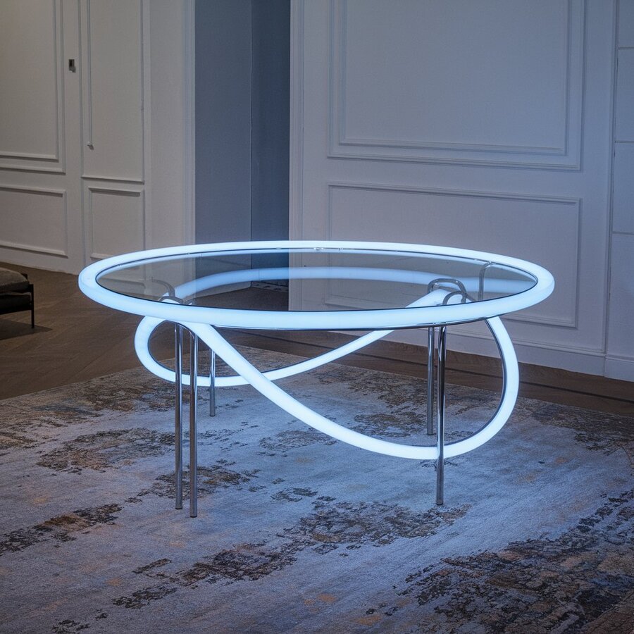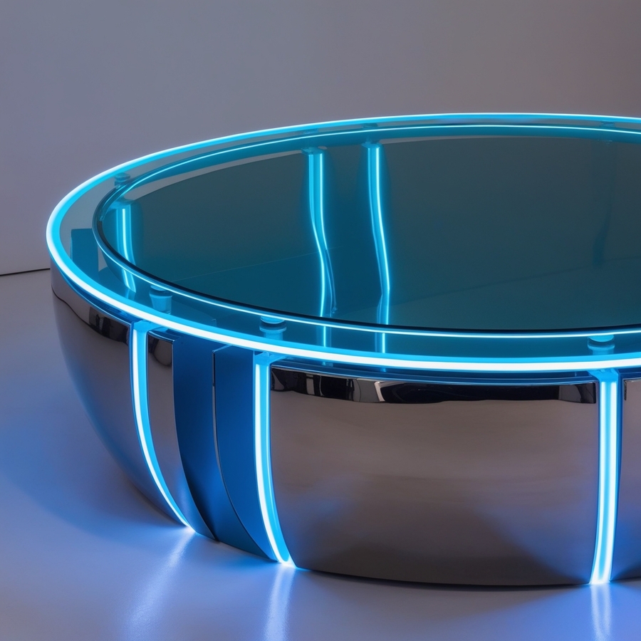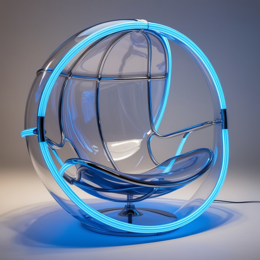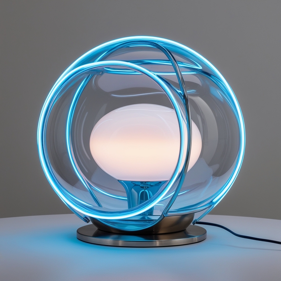 Prompt: The lamp (chair/ table) has a smooth shape in the style of a blobitecture, the distinctive feature of which is the blue luminous frame lines. materials glass, neon, small amount of metal