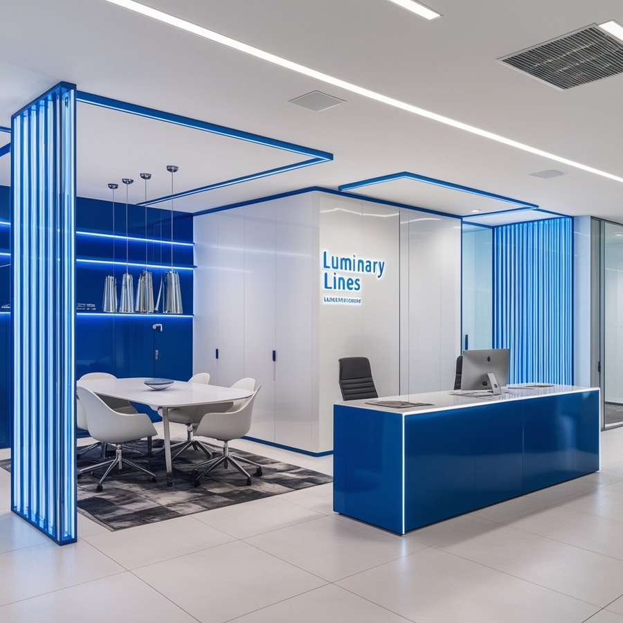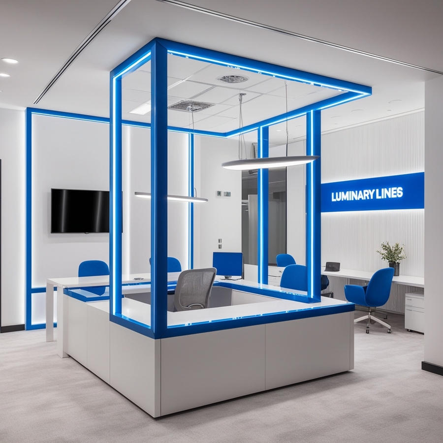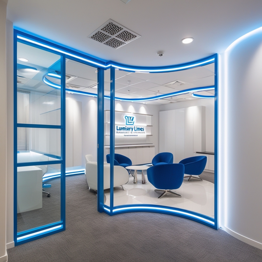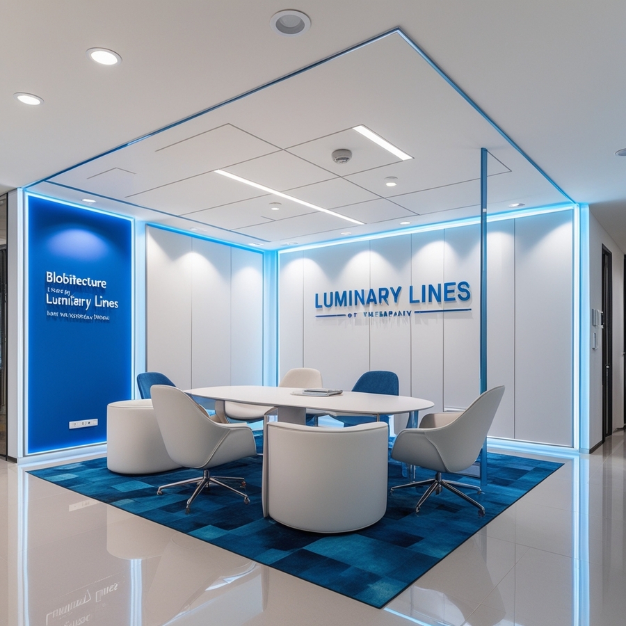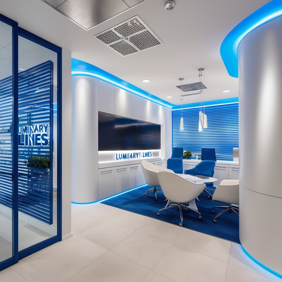 Prompt1: the interior of the office of the company Luminary Lines for the production of furniture and decorative elements of smooth shapes in the style of blobitecture, the distinctive feature of which are the blue luminous lines of the frame. Interior colors: white, blue, slight addition of metal is allowed. To create labels, use the Meteoric otf (700) font