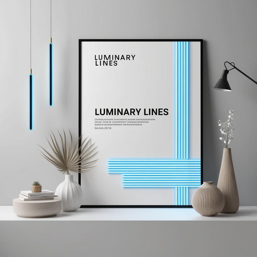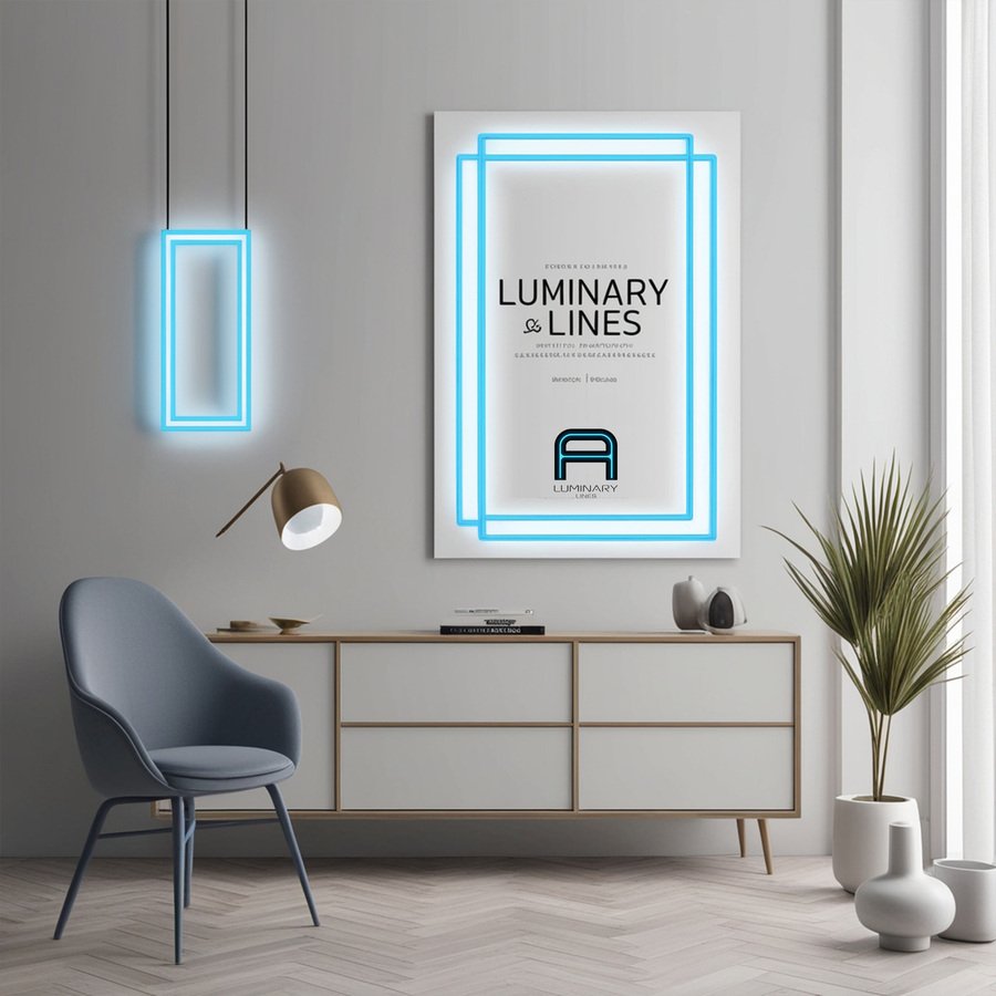 Prompt1: create a minimalistic poster with a small number of details for the company Luminary Lines for the production of furniture and decor elements of smooth shapes in the style of blobitecture, a distinctive feature of which are blue luminous frame lines
