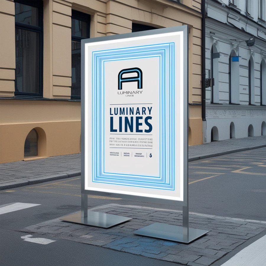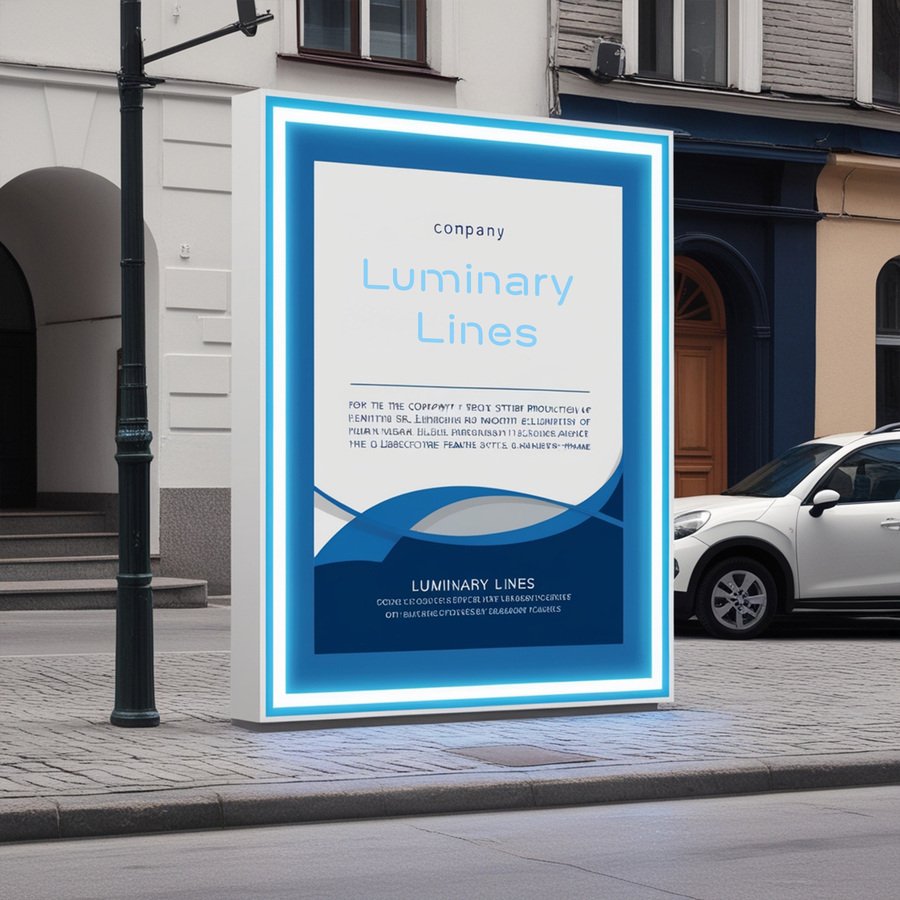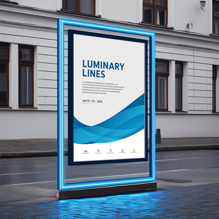 Prompt2: create a street poster for the company Luminary Lines for the production of furniture and decorative elements of smooth shapes in the style of blobitecture, the distinctive feature of which are the blue luminous lines of the frame. Colors: white, blue show only posters without unnecessary details