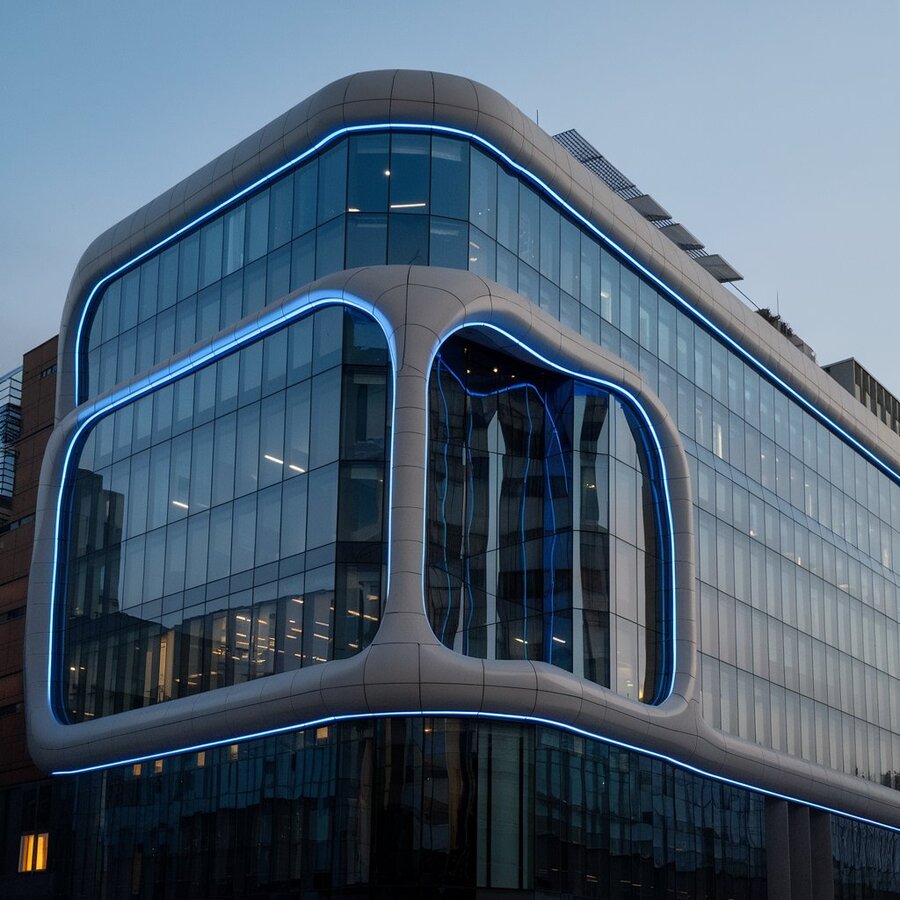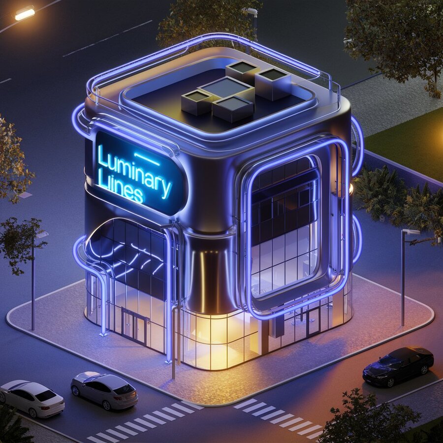 Prompt for Leonardo.AI: create an office building for the company Luminary Lines for the production of furniture and decorative elements of smooth shapes in the style of blobitecture, the distinctive feature of which are the blue luminous lines of the frame. Materials: neon, metal, glass