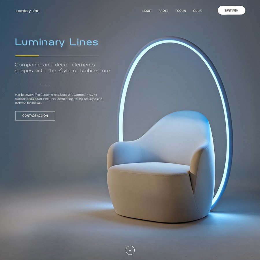 Prompt: create a minimalistic website with a small number of details for the company Luminary Lines for the production of furniture and decor elements of smooth shapes in the style of blobitecture, a distinctive feature of which are blue luminous frame lines