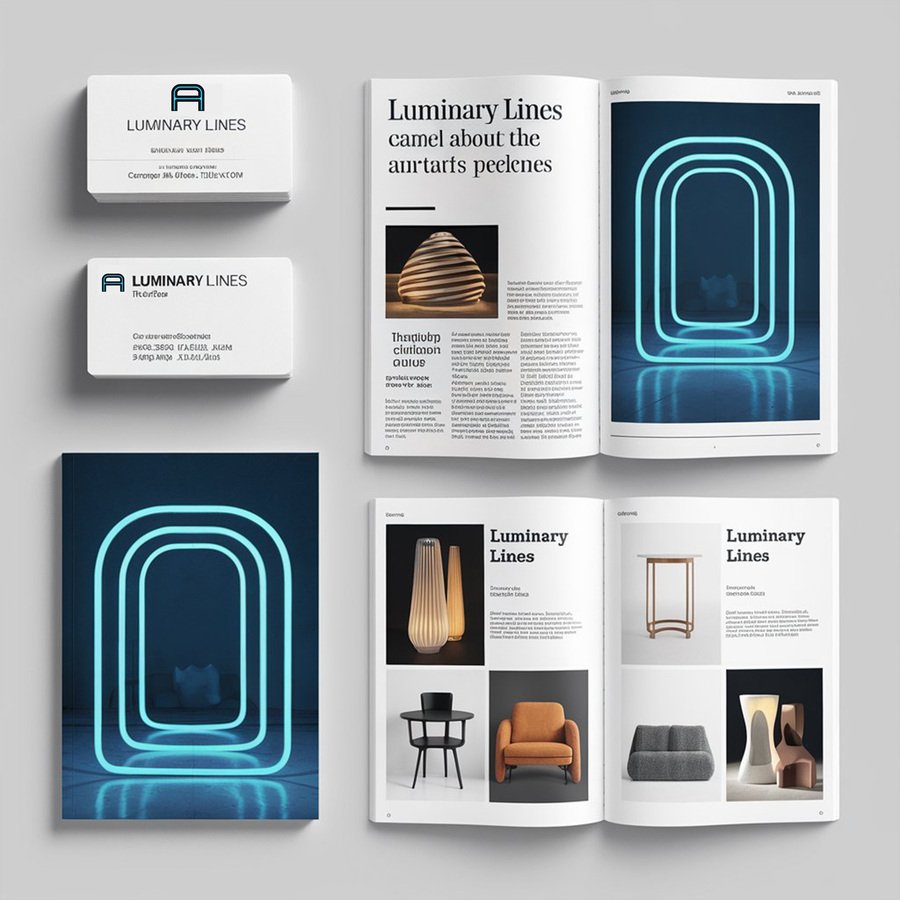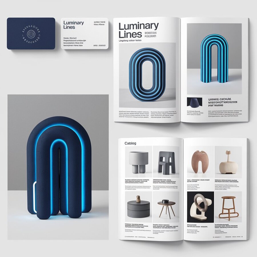 Prompt for Ideogram: Use https://ideogram.ai/g/FvM5ScXfQwWKpno76A2Drw/3 on mockups of business cards, magazines, catalogsfor the company Luminary Lines for the production of furniture and decorative elements of smooth shapes in the style of blobitecture, the distinctive feature of which are the blue luminous lines of the frame