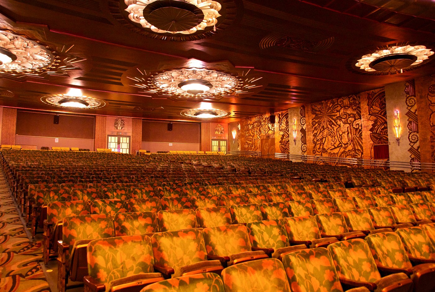 Интерьеры американских кинотеатров — это идеальный пример слияния архитектуры и дизайна Ар-деко. Золото, зеркала, богатые рельефы создавали эффект сказки, капиталистической утопии, побуждая людей покупать всё больше и больше. Западный Ар-деко становится способом воздействия через впечатление, он создает блеск, иллюзию изобилия.