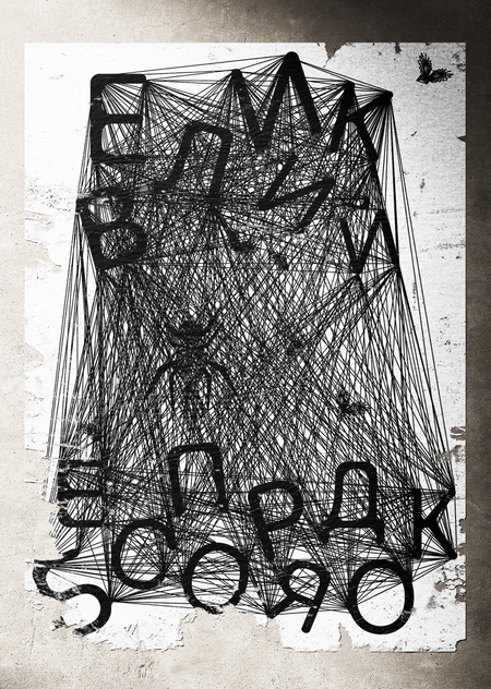 In one of the single line tears form a large web, in which is dissolved by letters, names and meanings. This structure is — a metaphor for confused connections, random coincidences and misunderstandings. It’s all connected to everything, but the logic of these connections is lost. In center — the figure of the spider, which simultaneously created and lost control of his own creation.