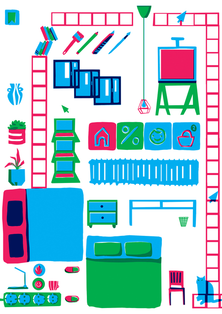 На выставке иллюстрации нанесены на атрибуты реальной жизни, чтобы буквально показать взаимосвязь двух «миров». Пространство галереи устроено на подобие магазинов IKEA, в которых от одного к другому мы погружаемся в различные бытовые интерьеры.
