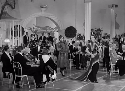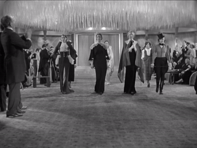 Эстетические принципы и особенности хореографии голливудских показов мод восходят к различным музыкальным шоу и ревю-программам, вроде «Безумств Зигфельда» [5]. Завораживающие дефиле хористок под музыкальное сопровождение, а также степенно спускающиеся по лестницам девушки в костюмах от звездных модных дизайнеров были частыми атрибутами подобных представлений. Наконец, многое заимствуется и из настоящих модных показов, особенно из различных концепций дефиле в домах мод и престижных универмагах, которые достаточно активно развивались на протяжении первой трети ХХ века [6]. Такое многообразие источников приводит к тому, что модные показы в голливудских фильмах сочетают в себе как черты классических дефиле в модных салонах, так и черты стилистики представлений музыкального театра.