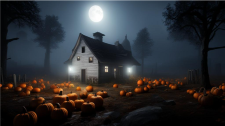 Промпты 1 изображение — farm with pumpkins, a white house with wooden roof, instruments such as shovel, forest surrouning the whole location, some monsters in the trees, night time, fog, unrealengine render