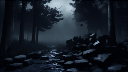 2 изображение — dark forest, a bunch of bricks and stones, destroyed booth. night time, fog, unrealengine render, realism