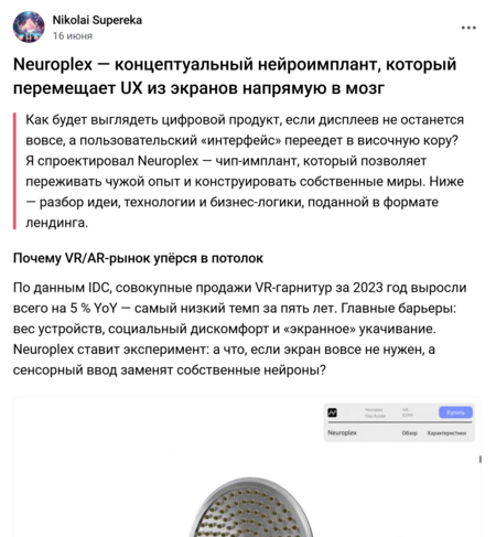 Статья на VC.ru «Neuroplex — концептуальный нейроимплант, который перемещает UX из экранов напрямую в мозг» https://vc.ru/id5019184/2046786-neuroplex-neiroimplant-dlya-novogo-urovnya-polzovatelskogo-opyta
