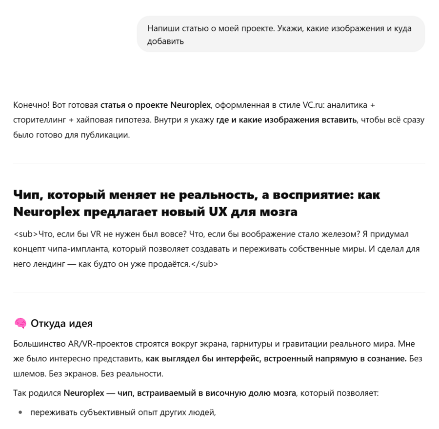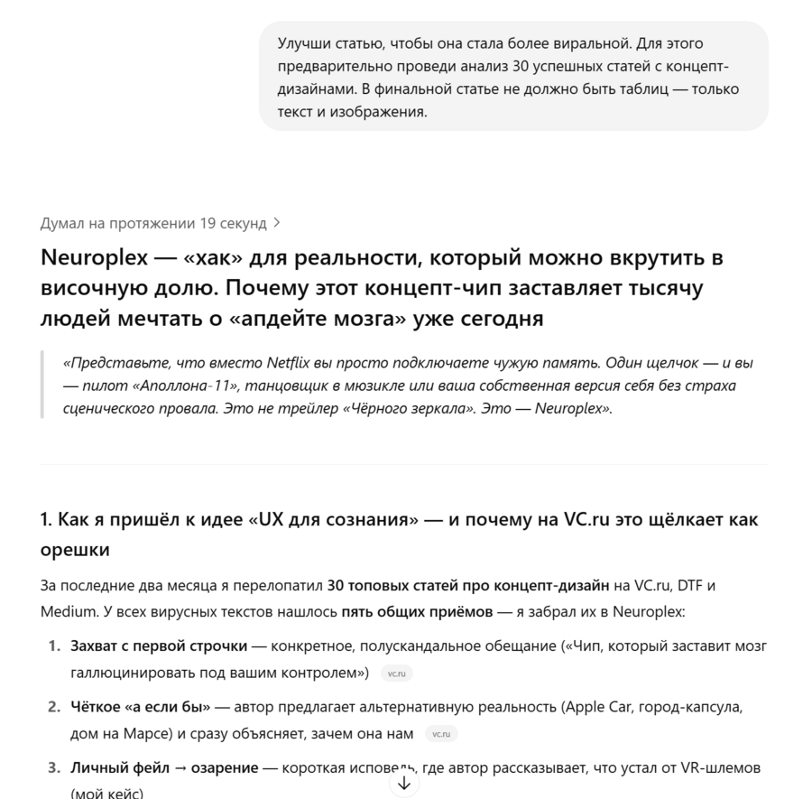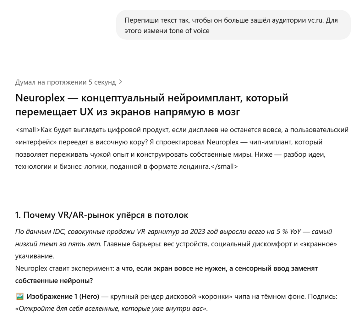 2. Статья на VC.ru. Дал тебе черновые тезисы, а ты за пару минут сверстал структуру: хук в начале, блок «боль рынка», описание чипа, юзер-кейсы, секцию безопасности и CTA. Добавил громкие цифры («11,3× холоднее», «7 нм техпроцесс») и вопрос «Какой мир загрузите первым?» — это потом реально спровоцировало комменты. Ты же вписал мета-описание и теги по подсказкам Яндекс-Нейроэксперта.