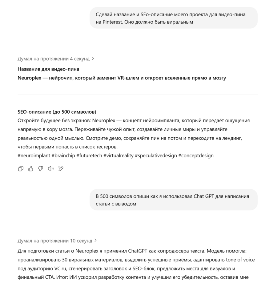 3. Сценарий ролика для Pinterest. Попросил короткий, до 15 секунд. Ты расписал кадр-лист: крупный рендер чипа → вспышка → надпись «Загружаем миры» → логотип. Добавил призыв «Сохрани пин, чтобы первым получить доступ». В том же сообщении выдал список хэштегов и SEO-фразу для описания.