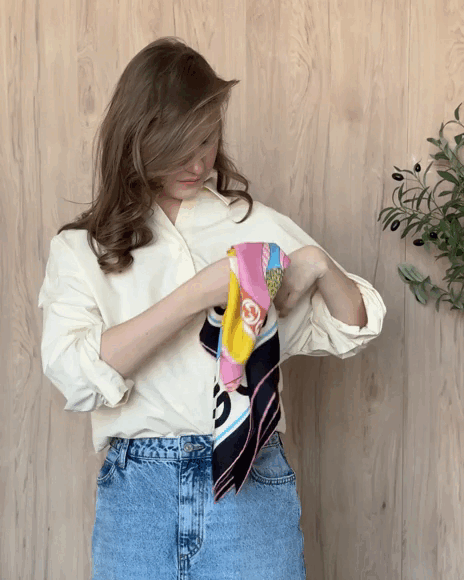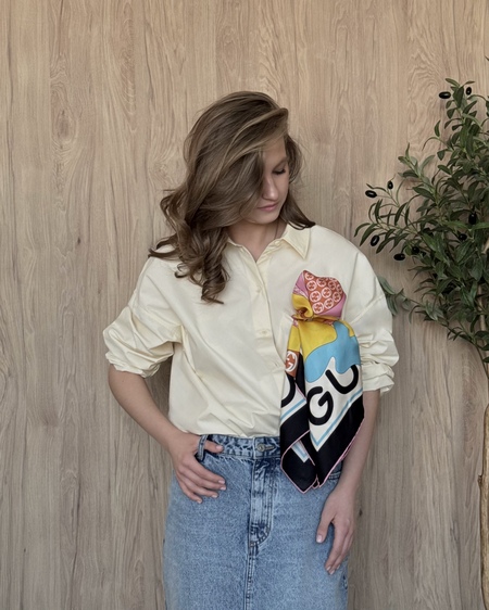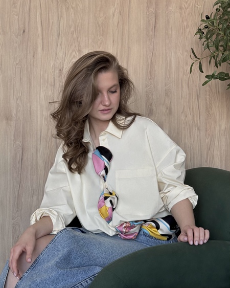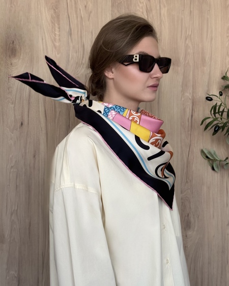 Для того, чтобы акцентировать внимание на основном предмете съемки, был выбран достаточно минималистичный образ, а сам платок — ярким.