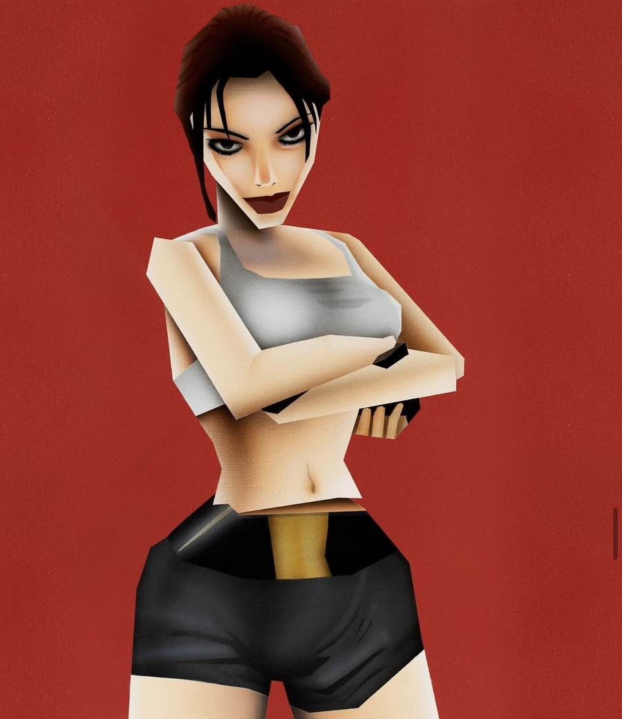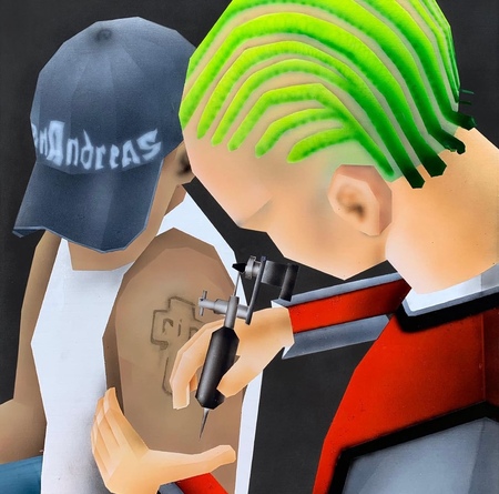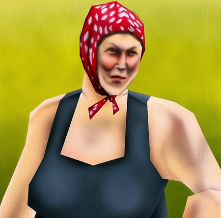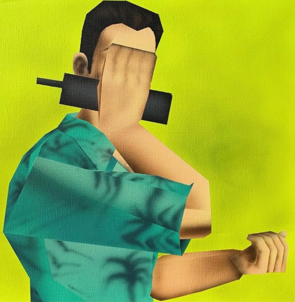 художница создаёт графичные, стилизованные работы в духе видеоигр 2000-х с упрощёнными формами и плоскими цветовыми блоками