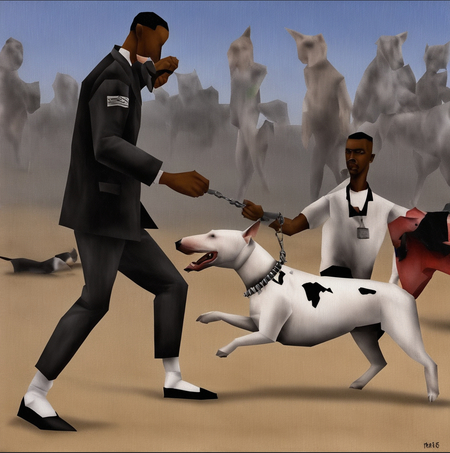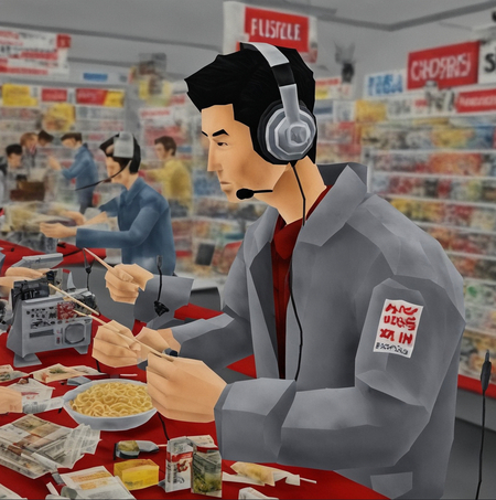 — a painting in WHATOONEE style, a black man is leashing a bull terrier wearing a spiked collar — a painting in WHATOONEE style, A Japanese man in a retro electronics store sits in headphones and eats noodles with chopsticks