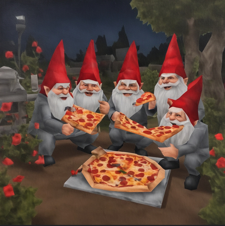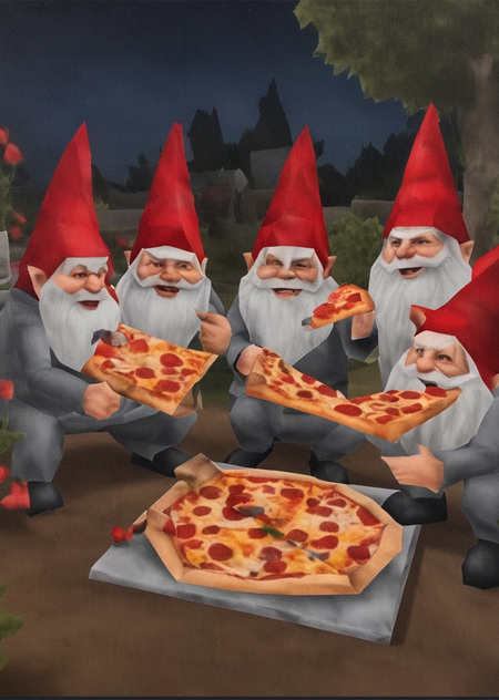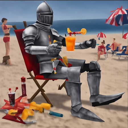 — a painting in WHATOONEE style, three gnomes in colored caps in the garden at night eating pizza — a painting in WHATOONEE style, a knight in armor sits on a beach chair drinking a cocktail