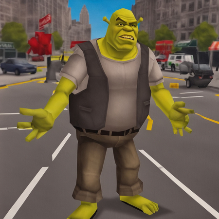— a painting in WHATOONEE style, Shrek is standing in the middle of the road in New York — a painting in WHATOONEE style, batman and joker are standing with their backs to us, they’re on the top floor of a skyscraper, holding each other’s hand and looking out the window, and outside the window are fireworks like in the movie «fight club»