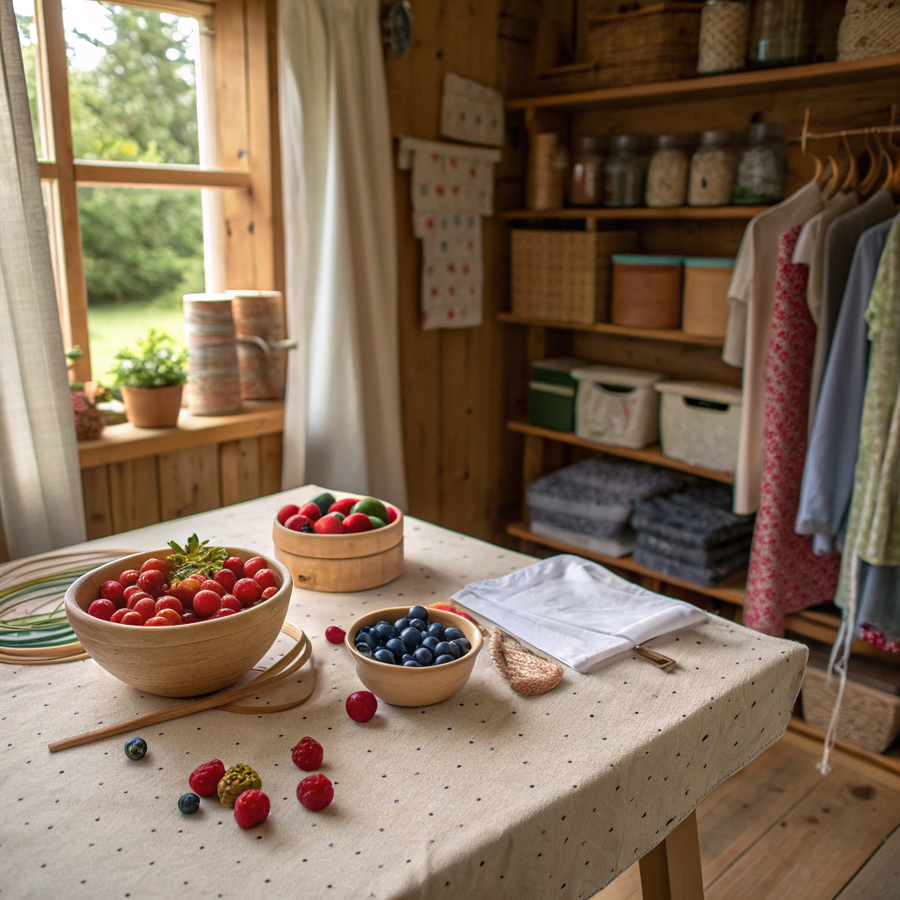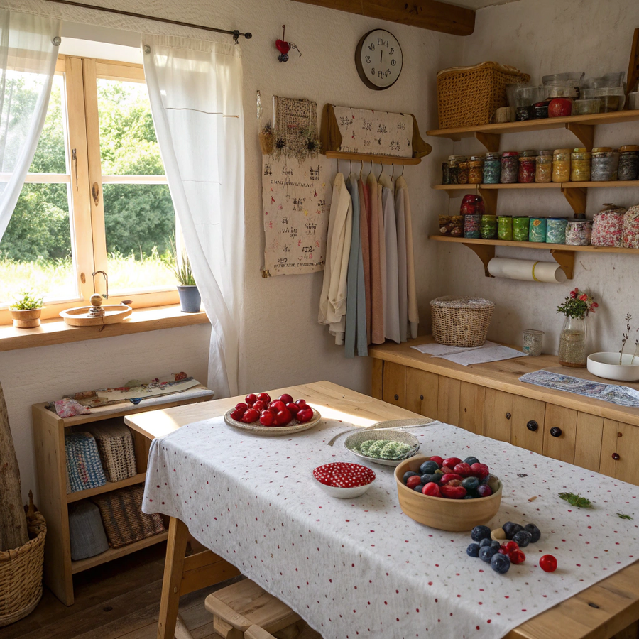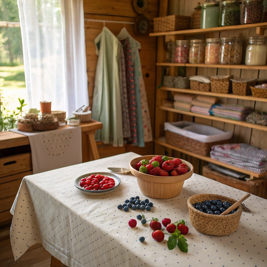 Prompt: A cozy handmade workshop inside a small countryside cottage. A wooden table covered with a light patterned tablecloth, scattered fresh berries — strawberries, raspberries, blueberries — around sewing tools, fabrics, and threads. Soft natural daylight streams through a window with light curtains. There are shelves with jars, fabric rolls, and handmade clothes. The atmosphere feels warm, calm, and rustic, filled with the scent of summer and craftwork. Natural textures of wood, linen, and berries, vintage countryside interior, slightly messy but very cozy workspace, artistic and homely mood. Generated in Recraft