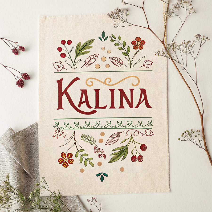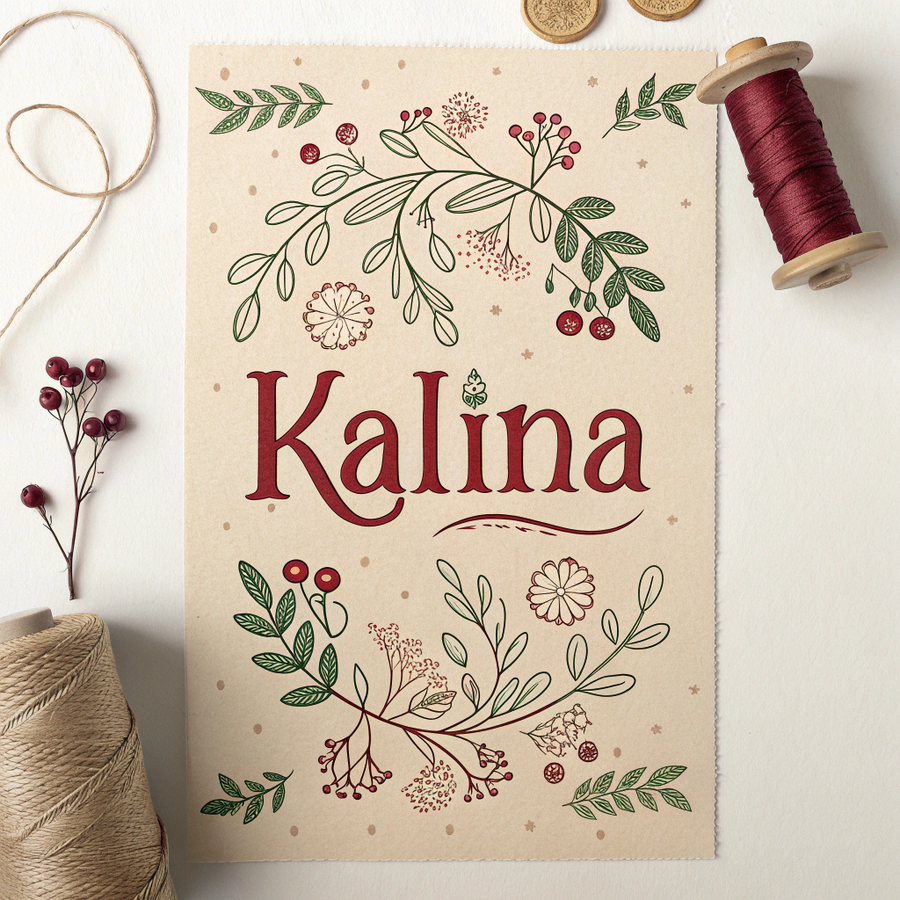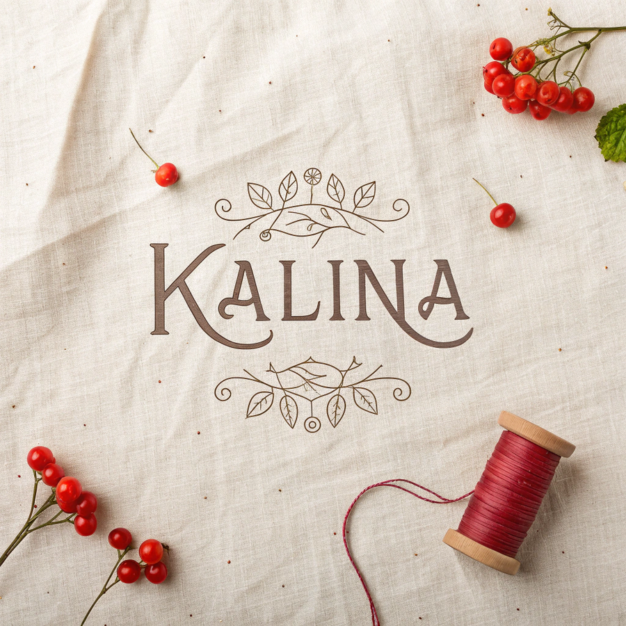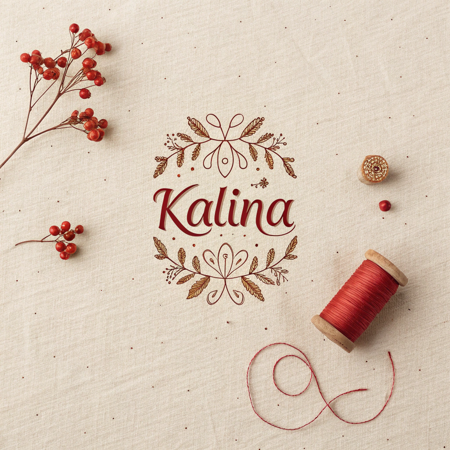 Promt: Brand logo for «Kalina», a small artisanal label creating handmade clothes in harmony with nature. The name «Калина» appears in warm red decorative Cyrillic font on a cream background with faint fabric texture. A few scattered thread lines or light berry motif evoke the feeling of handmade care. Soft daylight palette — red, beige, natural brown. Cozy, earthy, and authentic. Generated in Recraft