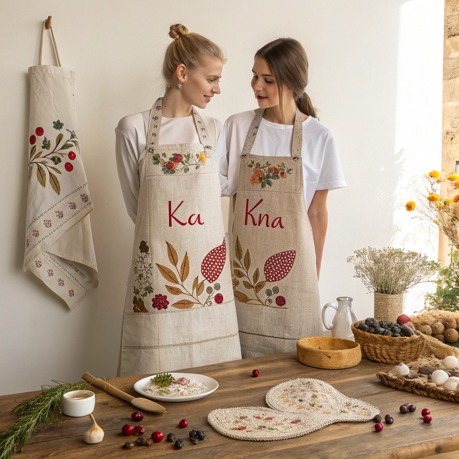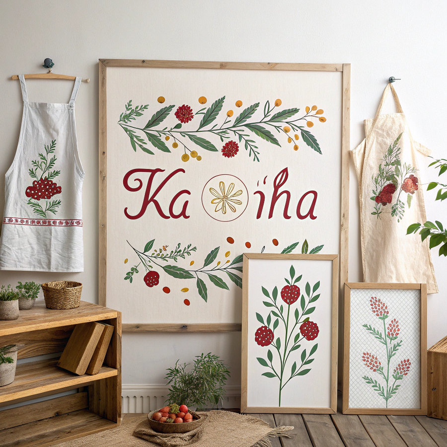 Promt: A set of identity carrier for «Kalina» — a small handmade clothing brand inspired by Russian countryside life and nature. The posters feature cozy rustic aesthetics: linen fabrics, handmade aprons, berry motifs, and natural textures like wood and linen. Include the brand name «Калина» in elegant decorative Cyrillic lettering, inspired by old Slavic style but clean and modern. The mood is warm, artisanal, and authentic — sunlight on a wooden table, scattered berries, sewing tools, natural fabrics. Design elements may include embroidery, wildflowers, or traditional patterns. Minimal yet soulful composition, suitable for craft fairs and brand promotion. Generated in Recraft